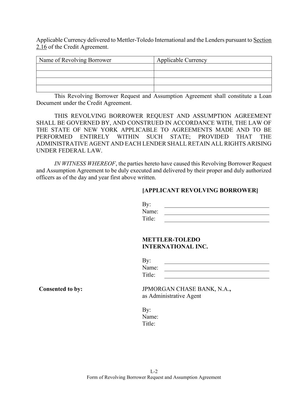 L-2 Form of Revolving Borrower Request and Assumption Agreement Applicable Currency delivered to Mettler-Toledo International and the Lenders pursuant to Section 2.16 of the Credit Agreement. Name of Revolving Borrower Applicable Currency This Revolving Borrower Request and Assumption Agreement shall constitute a Loan Document under the Credit Agreement. THIS REVOLVING BORROWER REQUEST AND ASSUMPTION AGREEMENT SHALL BE GOVERNED BY, AND CONSTRUED IN ACCORDANCE WITH, THE LAW OF THE STATE OF NEW YORK APPLICABLE TO AGREEMENTS MADE AND TO BE PERFORMED ENTIRELY WITHIN SUCH STATE; PROVIDED THAT THE ADMINISTRATIVE AGENT AND EACH LENDER SHALL RETAIN ALL RIGHTS ARISING UNDER FEDERAL LAW. IN WITNESS WHEREOF, the parties hereto have caused this Revolving Borrower Request and Assumption Agreement to be duly executed and delivered by their proper and duly authorized officers as of the day and year first above written. [APPLICANT REVOLVING BORROWER] By: Name: Title: METTLER-TOLEDO INTERNATIONAL INC. By: Name: Title: Consented to by: JPMORGAN CHASE BANK, N.A., as Administrative Agent By: Name: Title: