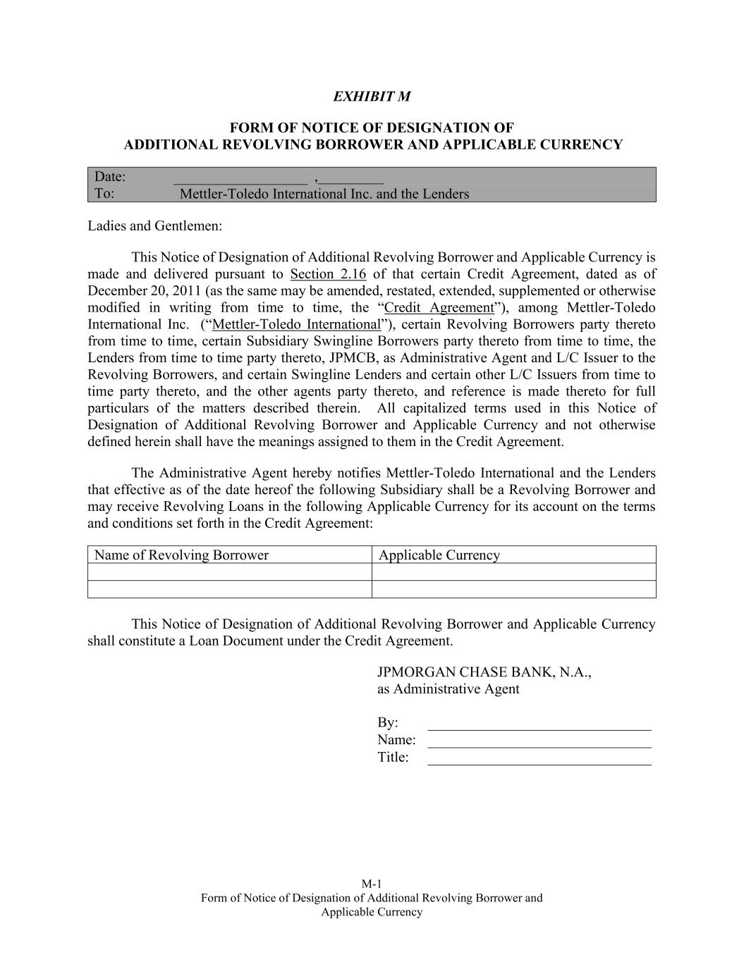 M-1 Form of Notice of Designation of Additional Revolving Borrower and Applicable Currency EXHIBIT M FORM OF NOTICE OF DESIGNATION OF ADDITIONAL REVOLVING BORROWER AND APPLICABLE CURRENCY Date: To: ,_________ Mettler-Toledo International Inc. and the Lenders Ladies and Gentlemen: This Notice of Designation of Additional Revolving Borrower and Applicable Currency is made and delivered pursuant to Section 2.16 of that certain Credit Agreement, dated as of December 20, 2011 (as the same may be amended, restated, extended, supplemented or otherwise modified in writing from time to time, the “Credit Agreement”), among Mettler-Toledo International Inc. (“Mettler-Toledo International”), certain Revolving Borrowers party thereto from time to time, certain Subsidiary Swingline Borrowers party thereto from time to time, the Lenders from time to time party thereto, JPMCB, as Administrative Agent and L/C Issuer to the Revolving Borrowers, and certain Swingline Lenders and certain other L/C Issuers from time to time party thereto, and the other agents party thereto, and reference is made thereto for full particulars of the matters described therein. All capitalized terms used in this Notice of Designation of Additional Revolving Borrower and Applicable Currency and not otherwise defined herein shall have the meanings assigned to them in the Credit Agreement. The Administrative Agent hereby notifies Mettler-Toledo International and the Lenders that effective as of the date hereof the following Subsidiary shall be a Revolving Borrower and may receive Revolving Loans in the following Applicable Currency for its account on the terms and conditions set forth in the Credit Agreement: Name of Revolving Borrower Applicable Currency This Notice of Designation of Additional Revolving Borrower and Applicable Currency shall constitute a Loan Document under the Credit Agreement. JPMORGAN CHASE BANK, N.A., as Administrative Agent By: Name: Title: