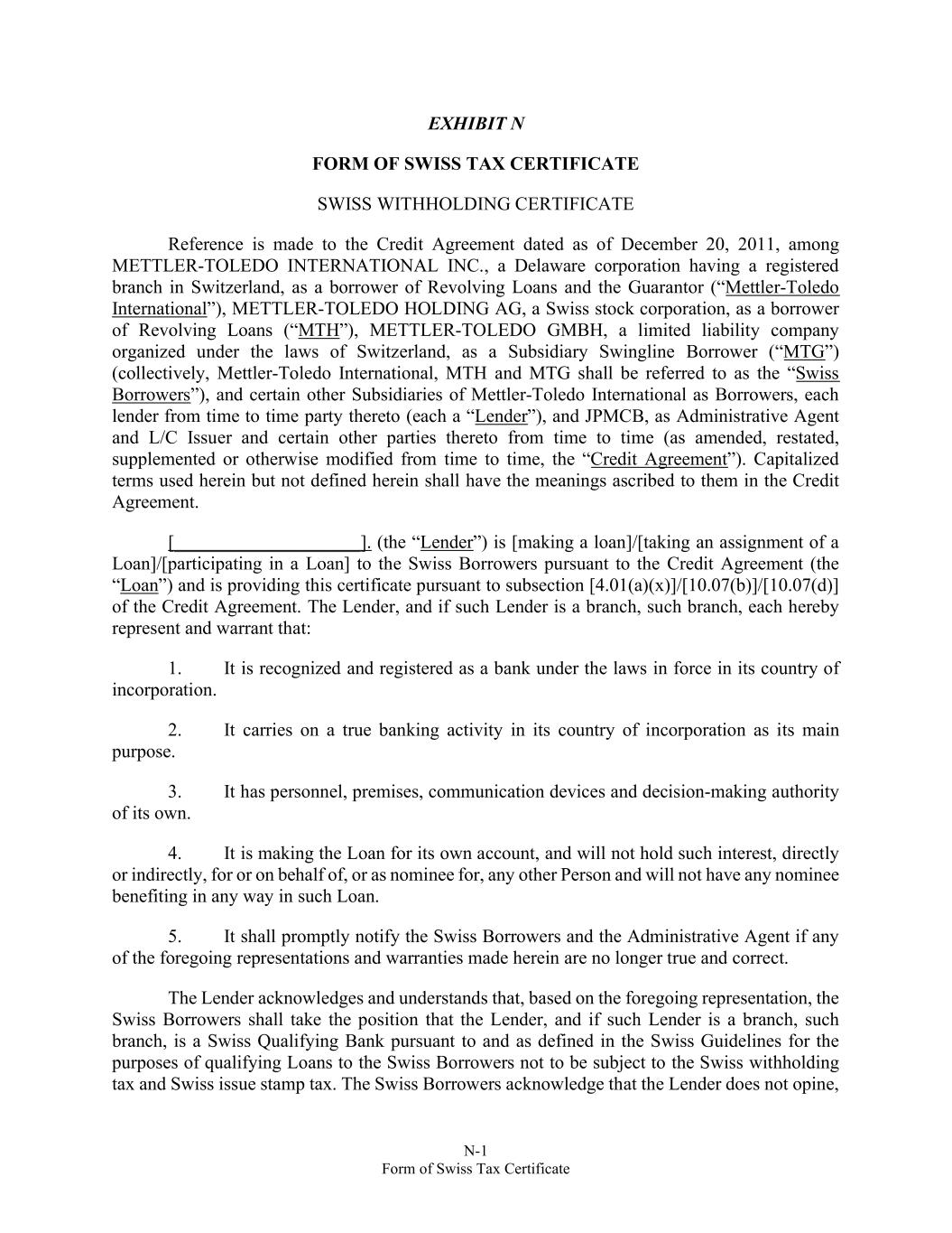 N-1 Form of Swiss Tax Certificate EXHIBIT N FORM OF SWISS TAX CERTIFICATE SWISS WITHHOLDING CERTIFICATE Reference is made to the Credit Agreement dated as of December 20, 2011, among METTLER-TOLEDO INTERNATIONAL INC., a Delaware corporation having a registered branch in Switzerland, as a borrower of Revolving Loans and the Guarantor (“Mettler-Toledo International”), METTLER-TOLEDO HOLDING AG, a Swiss stock corporation, as a borrower of Revolving Loans (“MTH”), METTLER-TOLEDO GMBH, a limited liability company organized under the laws of Switzerland, as a Subsidiary Swingline Borrower (“MTG”) (collectively, Mettler-Toledo International, MTH and MTG shall be referred to as the “Swiss Borrowers”), and certain other Subsidiaries of Mettler-Toledo International as Borrowers, each lender from time to time party thereto (each a “Lender”), and JPMCB, as Administrative Agent and L/C Issuer and certain other parties thereto from time to time (as amended, restated, supplemented or otherwise modified from time to time, the “Credit Agreement”). Capitalized terms used herein but not defined herein shall have the meanings ascribed to them in the Credit Agreement. [____________________]. (the “Lender”) is [making a loan]/[taking an assignment of a Loan]/[participating in a Loan] to the Swiss Borrowers pursuant to the Credit Agreement (the “Loan”) and is providing this certificate pursuant to subsection [4.01(a)(x)]/[10.07(b)]/[10.07(d)] of the Credit Agreement. The Lender, and if such Lender is a branch, such branch, each hereby represent and warrant that: 1. It is recognized and registered as a bank under the laws in force in its country of incorporation. 2. It carries on a true banking activity in its country of incorporation as its main purpose. 3. It has personnel, premises, communication devices and decision-making authority of its own. 4. It is making the Loan for its own account, and will not hold such interest, directly or indirectly, for or on behalf of, or as nominee for, any other Person and will not have any nominee benefiting in any way in such Loan. 5. It shall promptly notify the Swiss Borrowers and the Administrative Agent if any of the foregoing representations and warranties made herein are no longer true and correct. The Lender acknowledges and understands that, based on the foregoing representation, the Swiss Borrowers shall take the position that the Lender, and if such Lender is a branch, such branch, is a Swiss Qualifying Bank pursuant to and as defined in the Swiss Guidelines for the purposes of qualifying Loans to the Swiss Borrowers not to be subject to the Swiss withholding tax and Swiss issue stamp tax. The Swiss Borrowers acknowledge that the Lender does not opine,