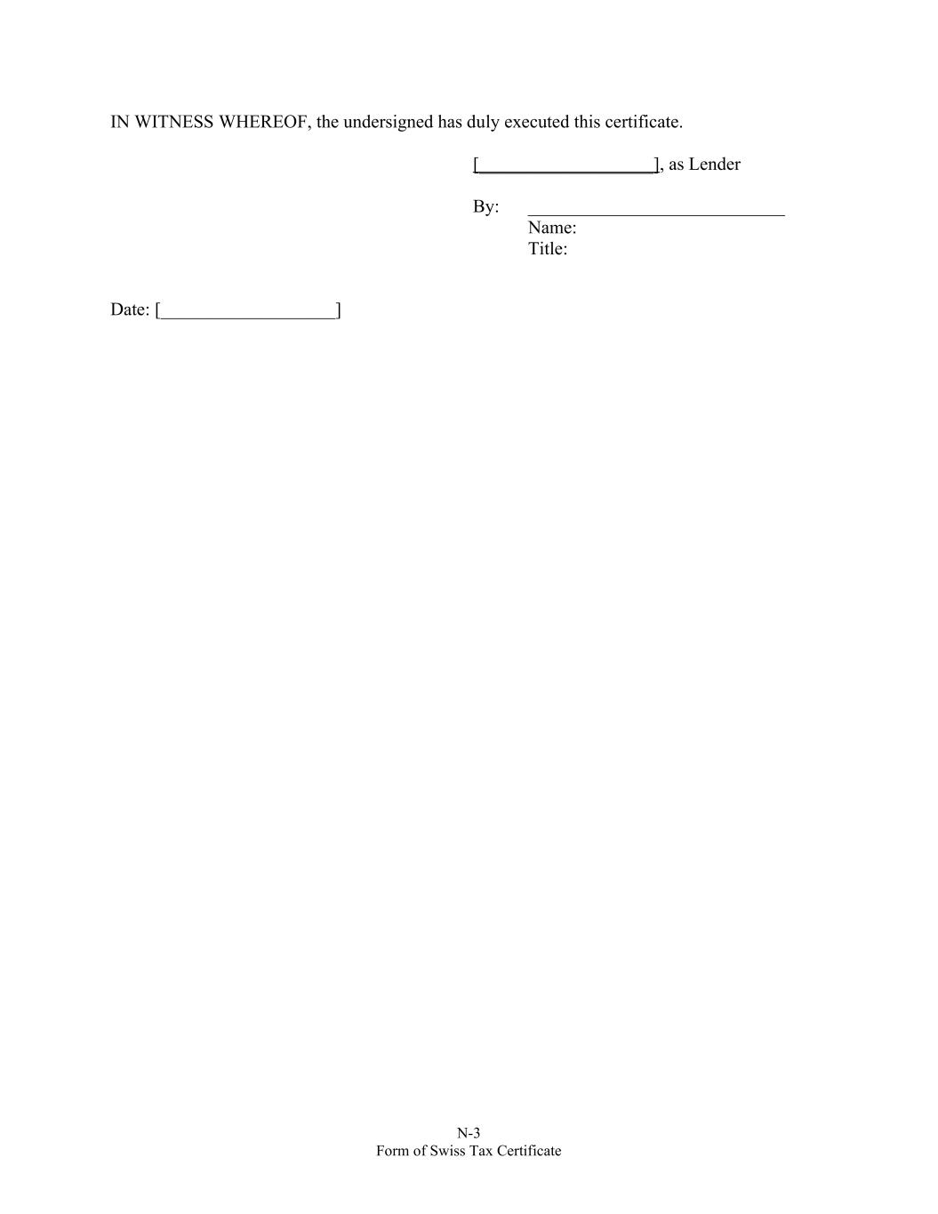 N-3 Form of Swiss Tax Certificate IN WITNESS WHEREOF, the undersigned has duly executed this certificate. [___________________], as Lender By: ____________________________ Name: Title: Date: [___________________]