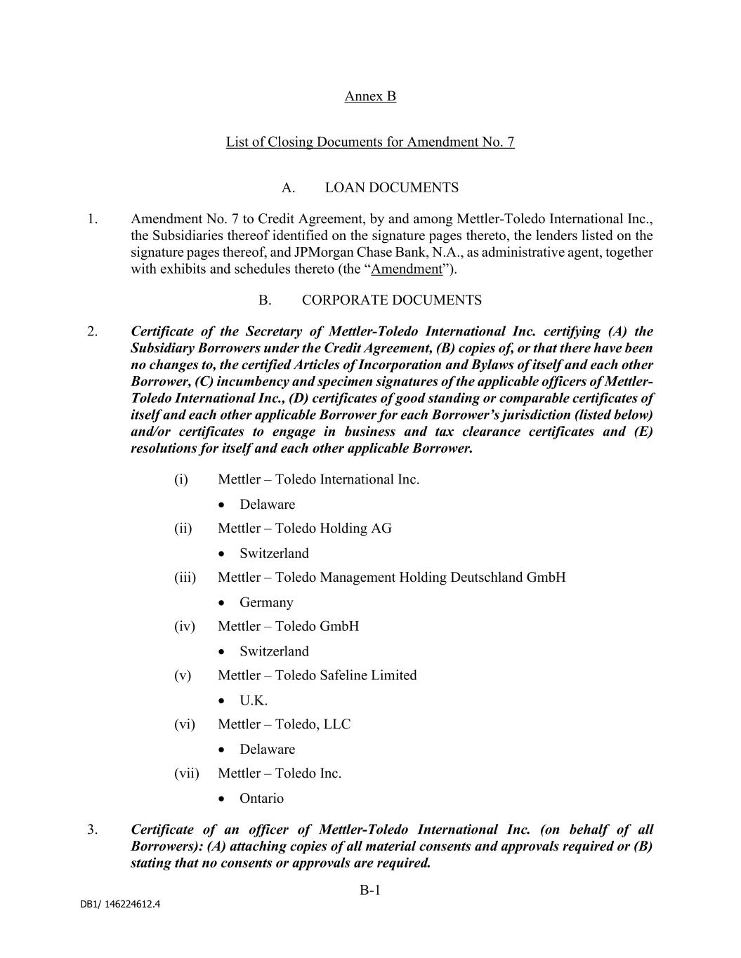 B-1 DB1/ 146224612.4 Annex B List of Closing Documents for Amendment No. 7 A. LOAN DOCUMENTS 1. Amendment No. 7 to Credit Agreement, by and among Mettler-Toledo International Inc., the Subsidiaries thereof identified on the signature pages thereto, the lenders listed on the signature pages thereof, and JPMorgan Chase Bank, N.A., as administrative agent, together with exhibits and schedules thereto (the “Amendment”). B. CORPORATE DOCUMENTS 2. Certificate of the Secretary of Mettler-Toledo International Inc. certifying (A) the Subsidiary Borrowers under the Credit Agreement, (B) copies of, or that there have been no changes to, the certified Articles of Incorporation and Bylaws of itself and each other Borrower, (C) incumbency and specimen signatures of the applicable officers of Mettler- Toledo International Inc., (D) certificates of good standing or comparable certificates of itself and each other applicable Borrower for each Borrower’s jurisdiction (listed below) and/or certificates to engage in business and tax clearance certificates and (E) resolutions for itself and each other applicable Borrower. (i) Mettler – Toledo International Inc.  Delaware (ii) Mettler – Toledo Holding AG  Switzerland (iii) Mettler – Toledo Management Holding Deutschland GmbH  Germany (iv) Mettler – Toledo GmbH  Switzerland (v) Mettler – Toledo Safeline Limited  U.K. (vi) Mettler – Toledo, LLC  Delaware (vii) Mettler – Toledo Inc.  Ontario 3. Certificate of an officer of Mettler-Toledo International Inc. (on behalf of all Borrowers): (A) attaching copies of all material consents and approvals required or (B) stating that no consents or approvals are required.