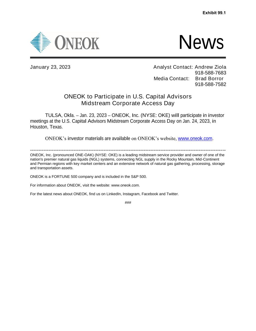 News ONEOK to Participate in U.S. Capital Advisors Midstream Corporate Access Day TULSA, Okla. – Jan. 23, 2023 – ONEOK, Inc. (NYSE: OKE) will participate in investor meetings at the U.S. Capital Advisors Midstream Corporate Access Day on Jan. 24, 2023, in Houston, Texas. ONEOK’s investor materials are available on ONEOK’s website, www.oneok.com. --------------------------------------------------------------------------------------------------------------------- ONEOK, Inc. (pronounced ONE-OAK) (NYSE: OKE) is a leading midstream service provider and owner of one of the nation's premier natural gas liquids (NGL) systems, connecting NGL supply in the Rocky Mountain, Mid-Continent and Permian regions with key market centers and an extensive network of natural gas gathering, processing, storage and transportation assets. ONEOK is a FORTUNE 500 company and is included in the S&P 500. For information about ONEOK, visit the website: www.oneok.com. For the latest news about ONEOK, find us on LinkedIn, Instagram, Facebook and Twitter. ### January 23, 2023 Analyst Contact: Andrew Ziola 918-588-7683 Media Contact: Brad Borror 918-588-7582 Exhibit 99.1
