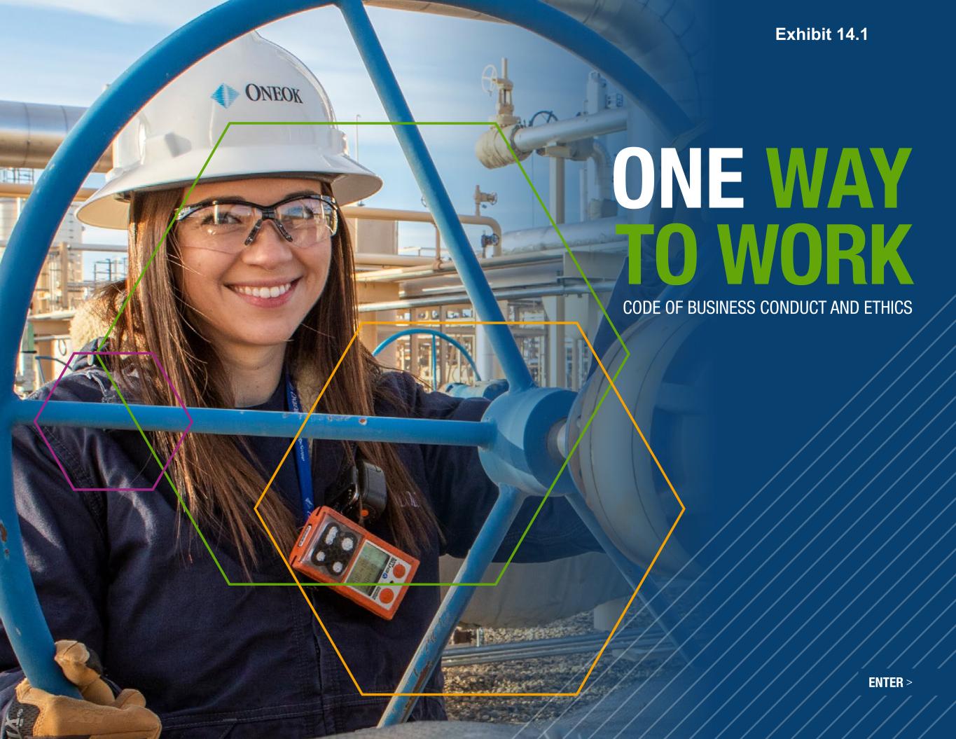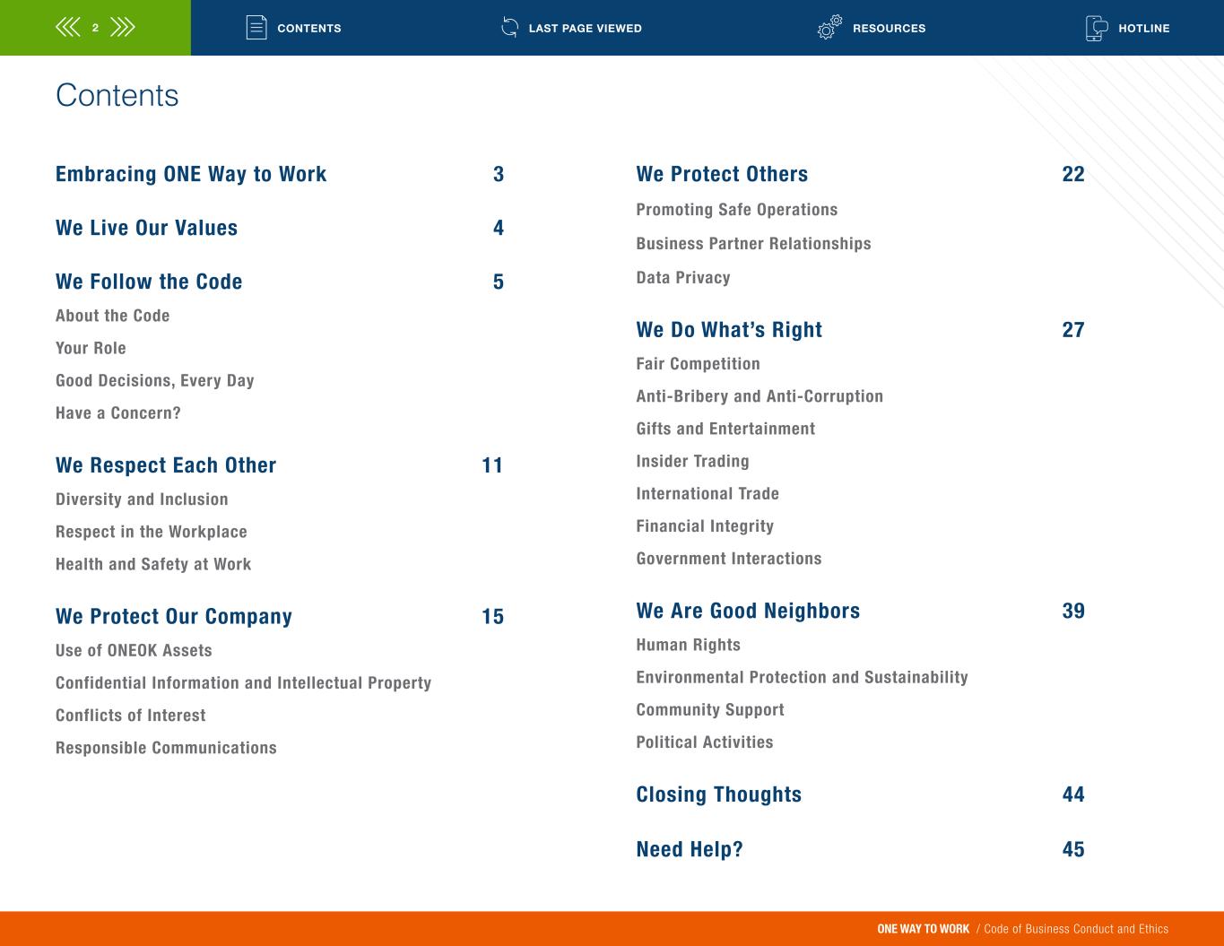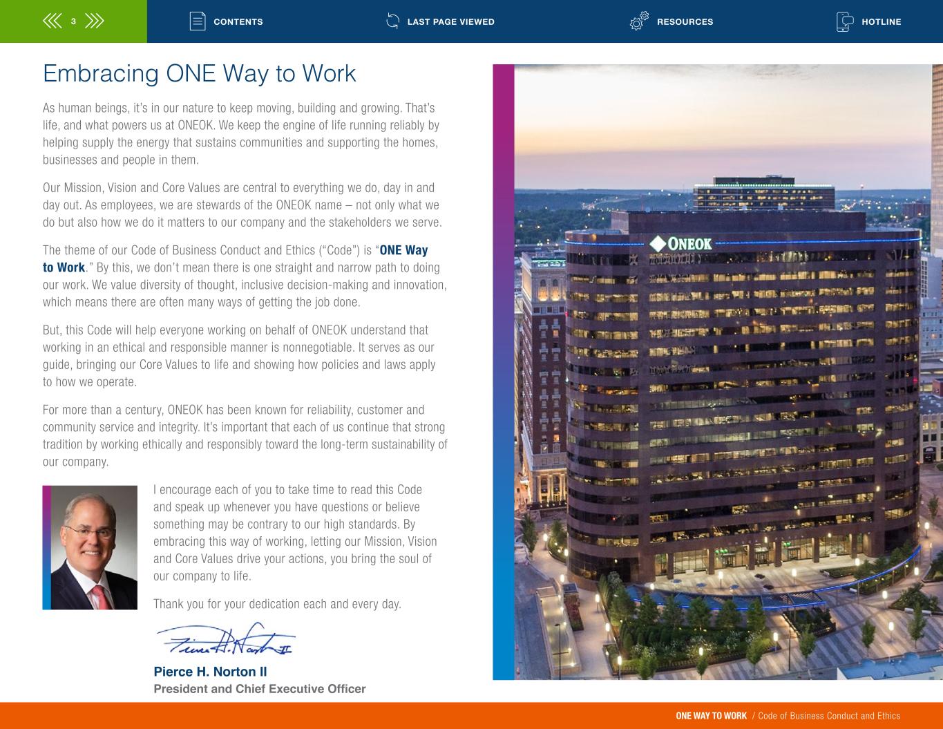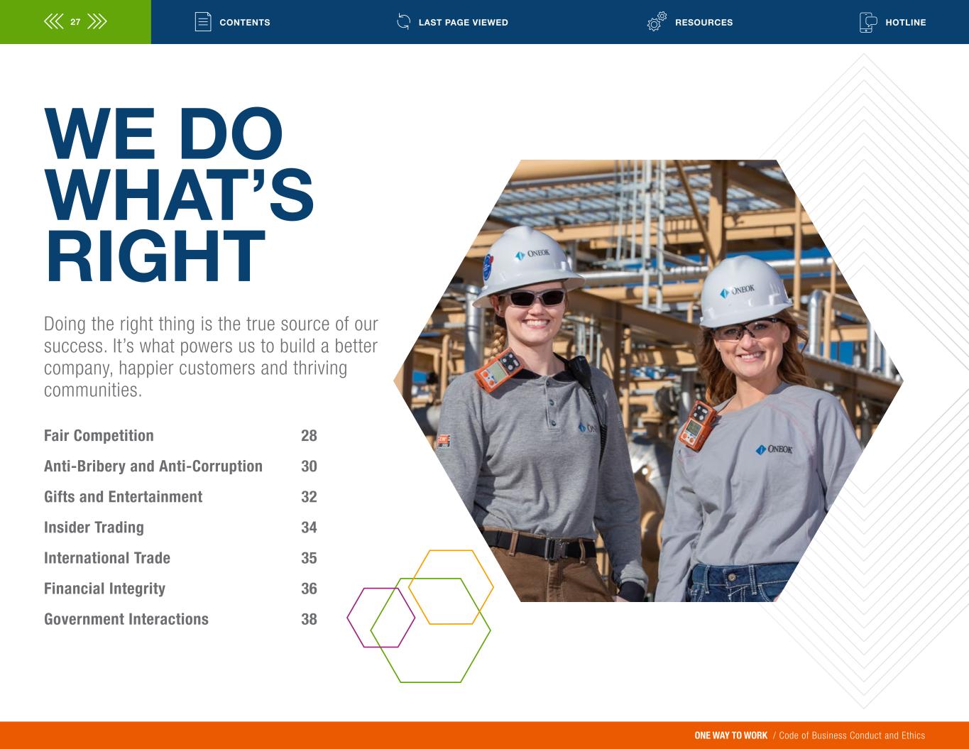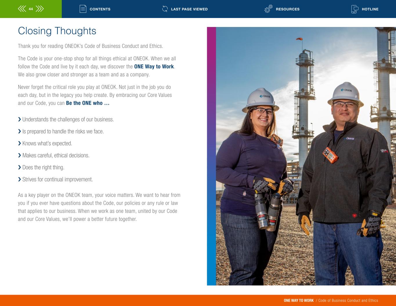 Closing Thoughts Thank you for reading ONEOK’s Code of Business Conduct and Ethics. The Code is your one-stop shop for all things ethical at ONEOK. When we all follow the Code and live by it each day, we discover the ONE Way to Work. We also grow closer and stronger as a team and as a company. Never forget the critical role you play at ONEOK. Not just in the job you do each day, but in the legacy you help create. By embracing our Core Values and our Code, you can Be the ONE who … › Understands the challenges of our business. › Is prepared to handle the risks we face. › Knows what’s expected. › Makes careful, ethical decisions. › Does the right thing. › Strives for continual improvement. As a key player on the ONEOK team, your voice matters. We want to hear from you if you ever have questions about the Code, our policies or any rule or law that applies to our business. When we work as one team, united by our Code and our Core Values, we’ll power a better future together. 44 ONE WAY TO WORK / Code of Business Conduct and Ethics CONTENTS RESOURCES HOTLINELAST PAGE VIEWED