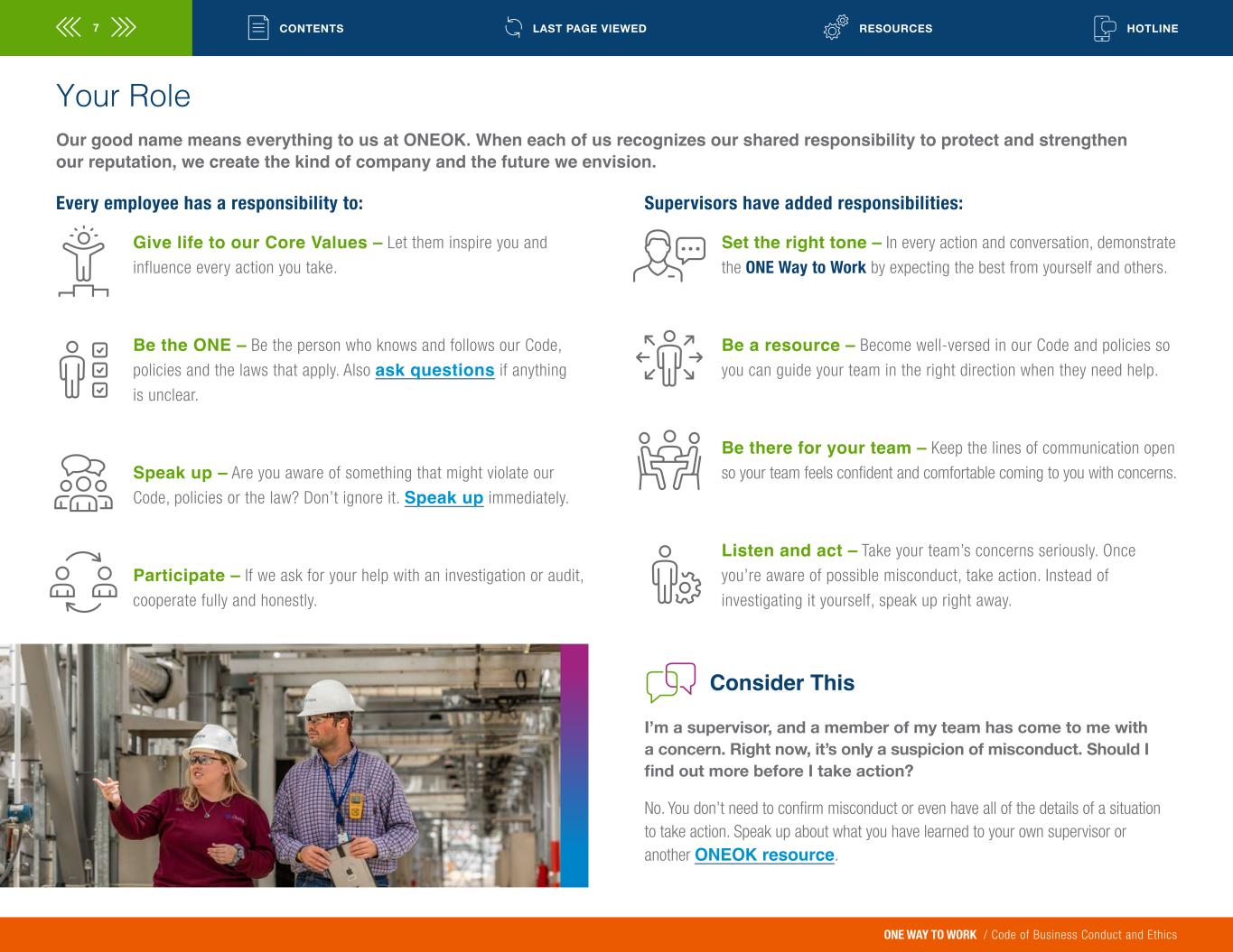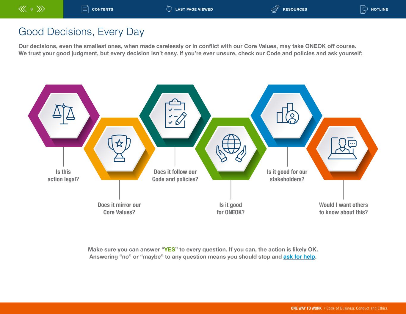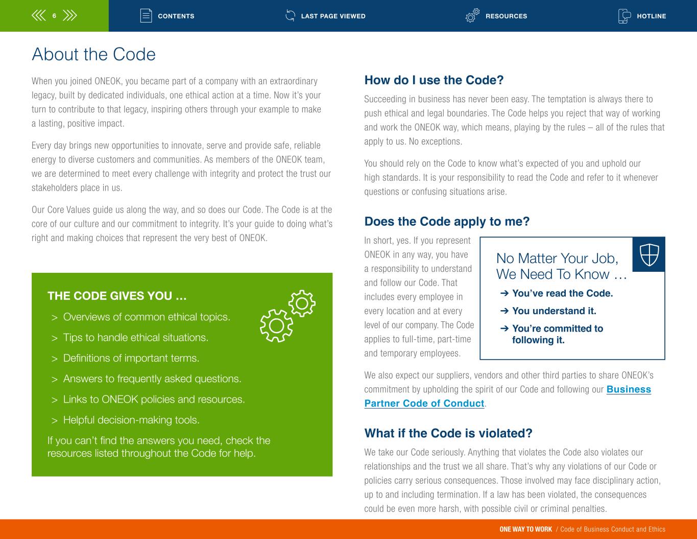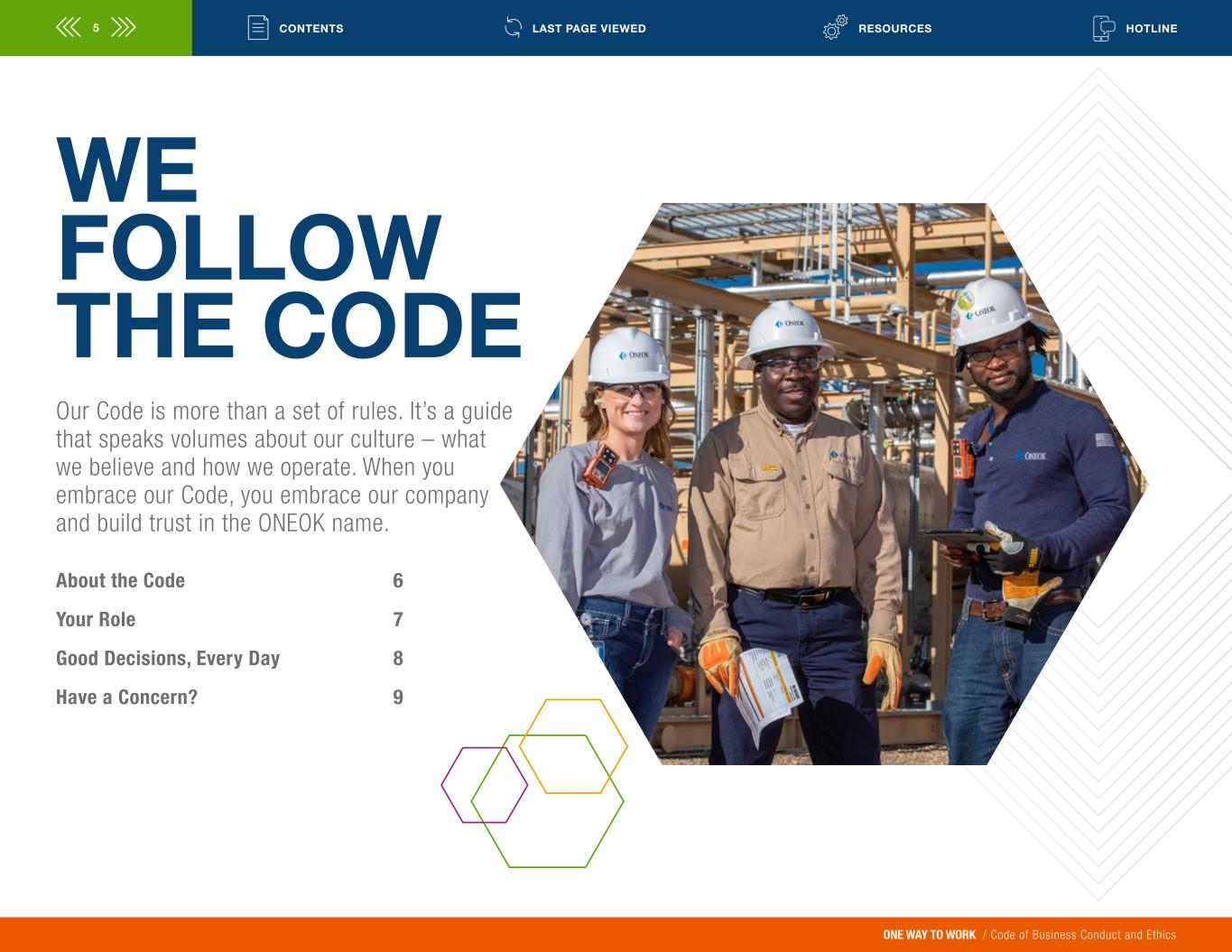 Our Code is more than a set of rules. It’s a guide that speaks volumes about our culture – what we believe and how we operate. When you embrace our Code, you embrace our company and build trust in the ONEOK name. About the Code 6 Your Role 7 Good Decisions, Every Day 8 Have a Concern? 9 WE FOLLOW THE CODE 5 ONE WAY TO WORK / Code of Business Conduct and Ethics CONTENTS RESOURCES HOTLINELAST PAGE VIEWED