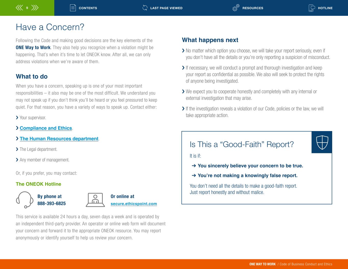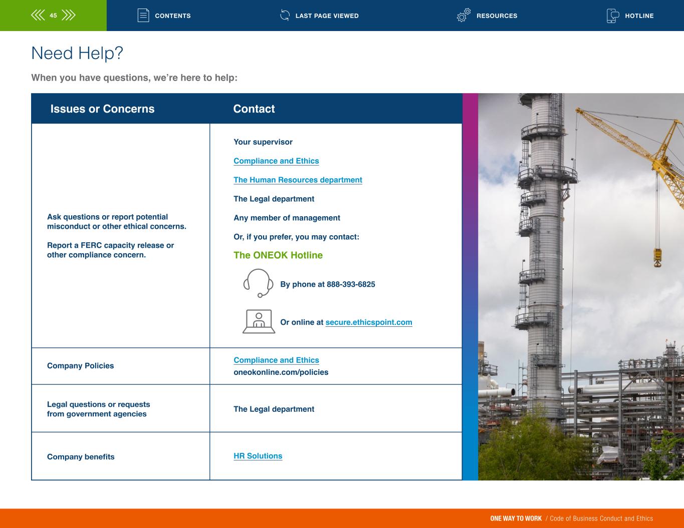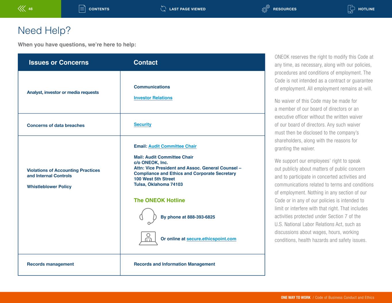 Need Help? When you have questions, we’re here to help: Issues or Concerns Contact Your supervisor Compliance and Ethics The Human Resources department The Legal department Any member of management Or, if you prefer, you may contact: The ONEOK Hotline By phone at 888-393-6825 Or online at secure.ethicspoint.com Ask questions or report potential misconduct or other ethical concerns. Report a FERC capacity release or other compliance concern. Company Policies Legal questions or requests from government agencies Company benefits The Legal department HR Solutions Compliance and Ethics o neokonline.com/policies 45 ONE WAY TO WORK / Code of Business Conduct and Ethics CONTENTS RESOURCES HOTLINELAST PAGE VIEWED