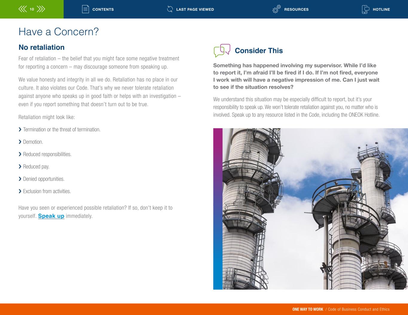 Have a Concern? No retaliation Fear of retaliation – the belief that you might face some negative treatment for reporting a concern – may discourage someone from speaking up. We value honesty and integrity in all we do. Retaliation has no place in our culture. It also violates our Code. That’s why we never tolerate retaliation against anyone who speaks up in good faith or helps with an investigation – even if you report something that doesn’t turn out to be true. Retaliation might look like: › Termination or the threat of termination. › Demotion. › Reduced responsibilities. › Reduced pay. › Denied opportunities. › Exclusion from activities. Have you seen or experienced possible retaliation? If so, don’t keep it to yourself. Speak up immediately. Consider This Something has happened involving my supervisor. While I’d like to report it, I’m afraid I’ll be fired if I do. If I’m not fired, everyone I work with will have a negative impression of me. Can I just wait to see if the situation resolves? We understand this situation may be especially difficult to report, but it’s your responsibility to speak up. We won’t tolerate retaliation against you, no matter who is involved. Speak up to any resource listed in the Code, including the ONEOK Hotline. 10 ONE WAY TO WORK / Code of Business Conduct and Ethics CONTENTS RESOURCES HOTLINELAST PAGE VIEWED