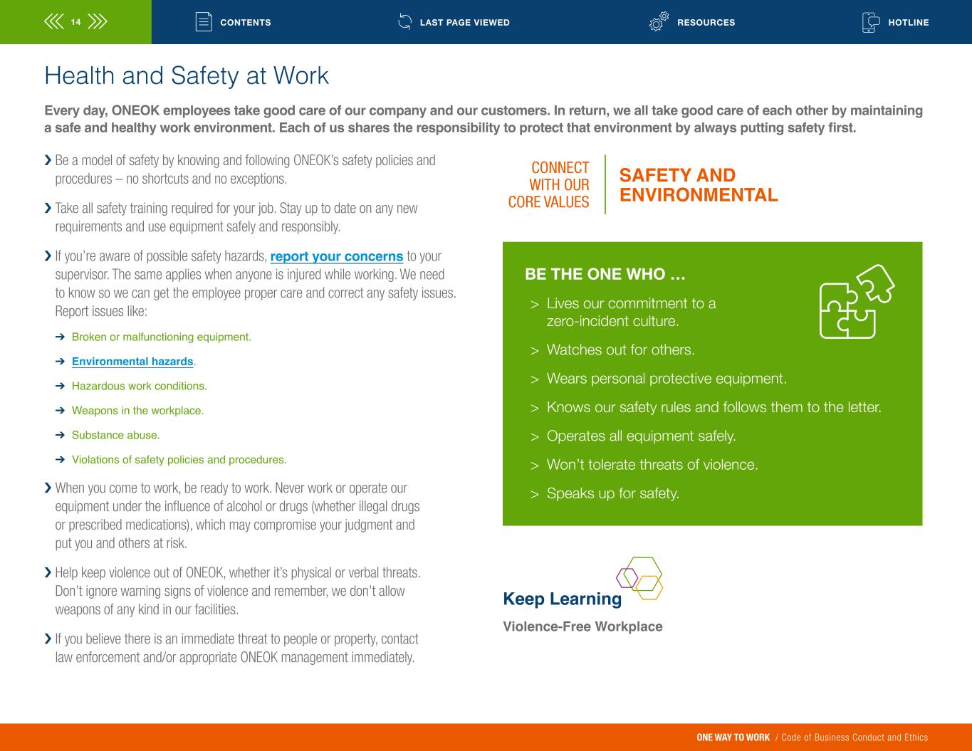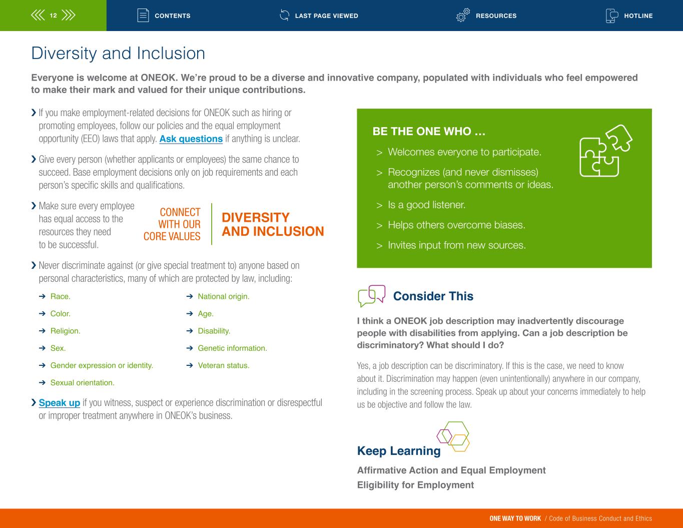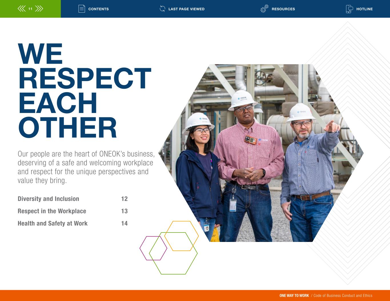 Our people are the heart of ONEOK’s business, deserving of a safe and welcoming workplace and respect for the unique perspectives and value they bring. Diversity and Inclusion 12 Respect in the Workplace 13 Health and Safety at Work 14 WE RESPECT EACH OTHER 11 ONE WAY TO WORK / Code of Business Conduct and Ethics CONTENTS RESOURCES HOTLINELAST PAGE VIEWED