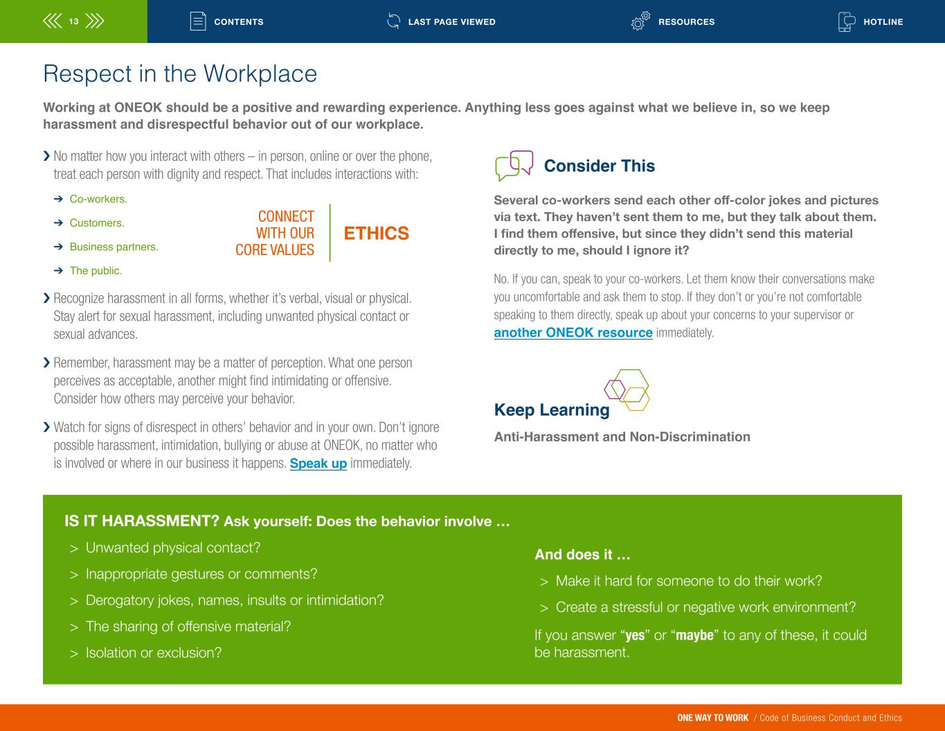 › No matter how you interact with others – in person, online or over the phone, treat each person with dignity and respect. That includes interactions with: ➔ Co-workers. ➔ Customers. ➔ Business partners. ➔ The public. › Recognize harassment in all forms, whether it’s verbal, visual or physical. Stay alert for sexual harassment, including unwanted physical contact or sexual advances. › Remember, harassment may be a matter of perception. What one person perceives as acceptable, another might find intimidating or offensive. Consider how others may perceive your behavior. › Watch for signs of disrespect in others’ behavior and in your own. Don’t ignore possible harassment, intimidation, bullying or abuse at ONEOK, no matter who is involved or where in our business it happens. Speak up immediately. Respect in the Workplace Working at ONEOK should be a positive and rewarding experience. Anything less goes against what we believe in, so we keep harassment and disrespectful behavior out of our workplace. Consider This Several co-workers send each other off-color jokes and pictures via text. They haven’t sent them to me, but they talk about them. I find them offensive, but since they didn’t send this material directly to me, should I ignore it? No. If you can, speak to your co-workers. Let them know their conversations make you uncomfortable and ask them to stop. If they don’t or you’re not comfortable speaking to them directly, speak up about your concerns to your supervisor or another ONEOK resource immediately. Keep Learning Anti-Harassment and Non-Discrimination IS IT HARASSMENT? Ask yourself: Does the behavior involve … > Unwanted physical contact? > Inappropriate gestures or comments? > Derogatory jokes, names, insults or intimidation? > The sharing of offensive material? > Isolation or exclusion? And does it … > Make it hard for someone to do their work? > Create a stressful or negative work environment? If you answer “yes” or “maybe” to any of these, it could be harassment. CONNECT WITH OUR CORE VALUES ETHICS 13 ONE WAY TO WORK / Code of Business Conduct and Ethics CONTENTS RESOURCES HOTLINELAST PAGE VIEWED