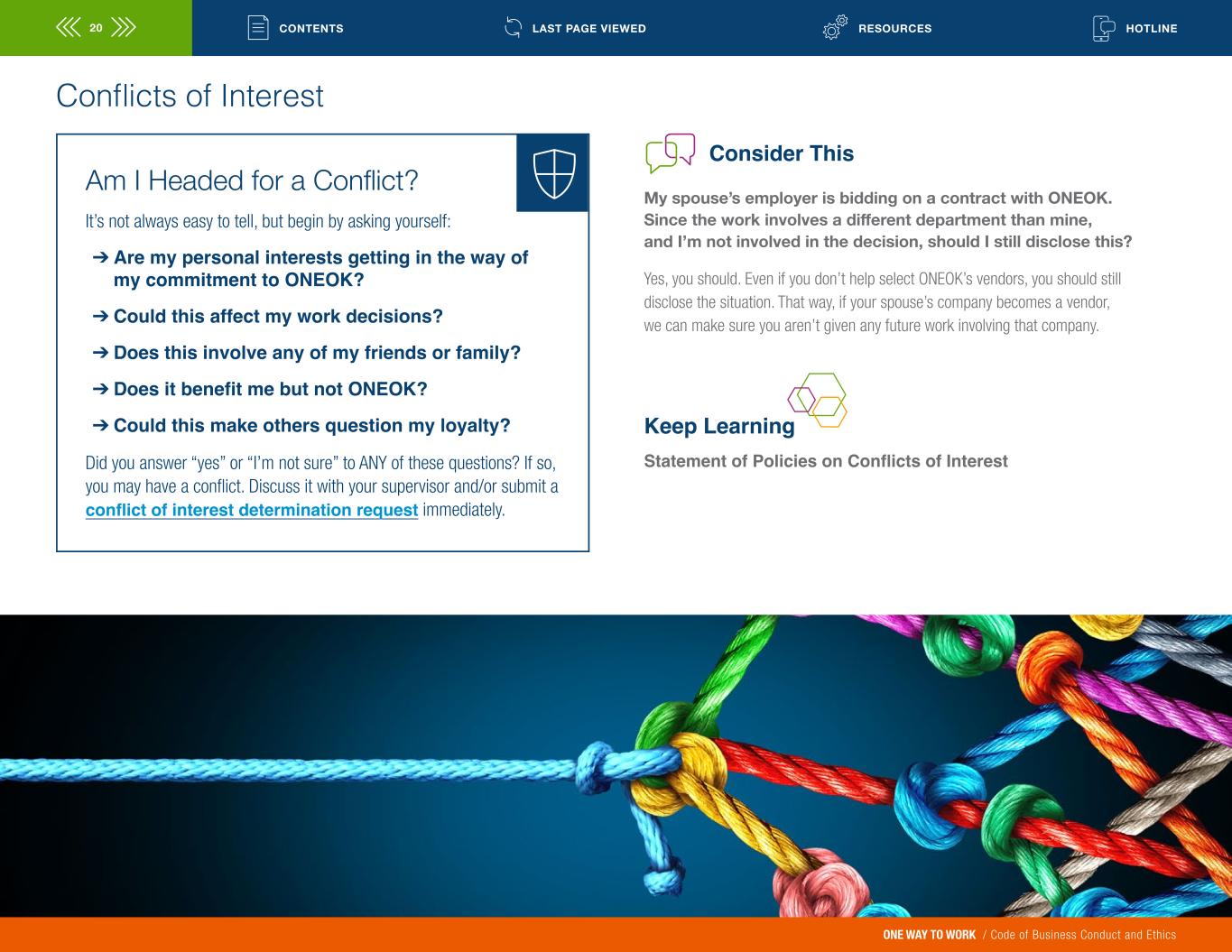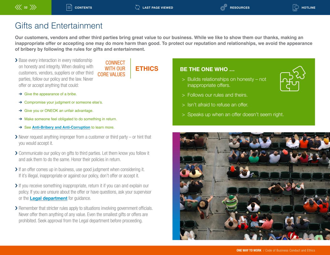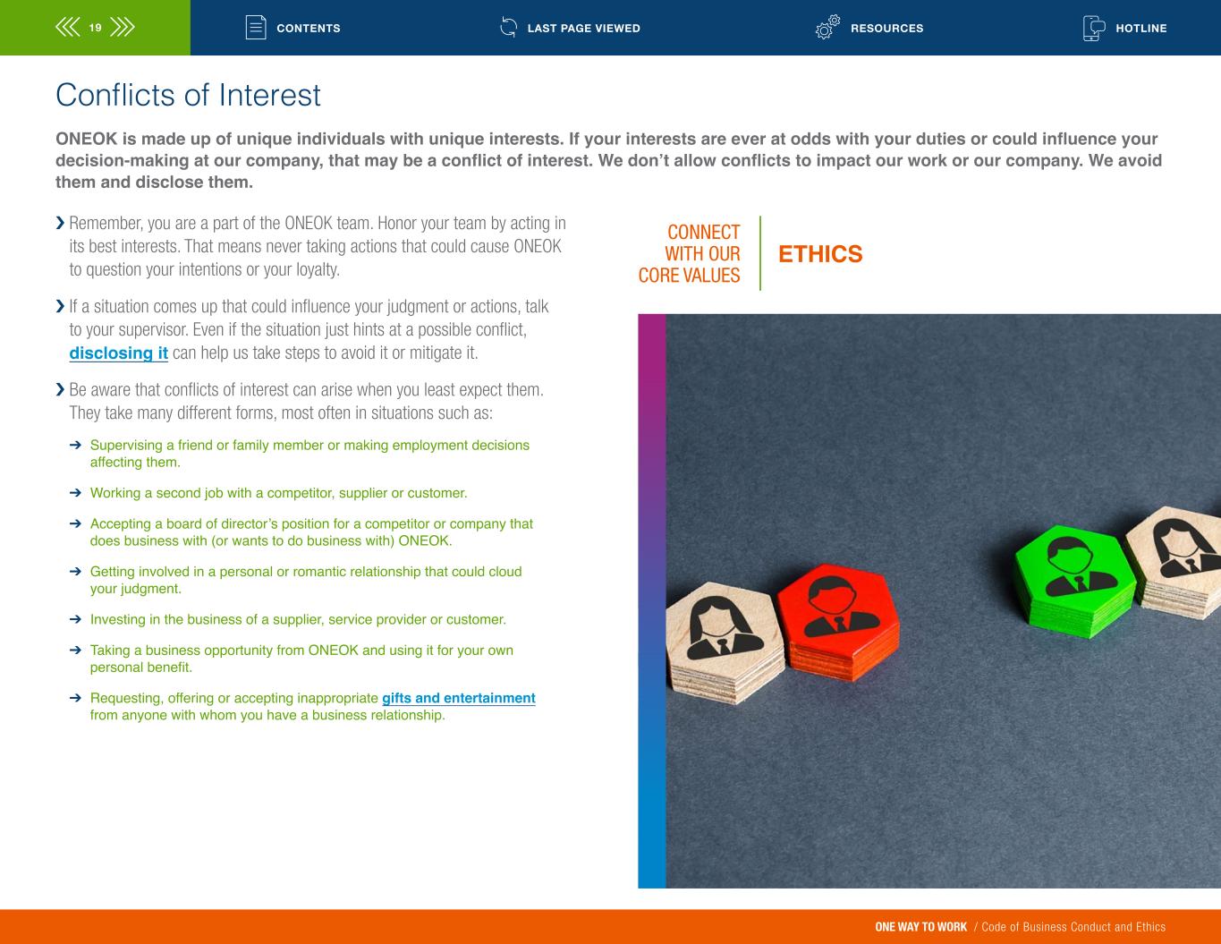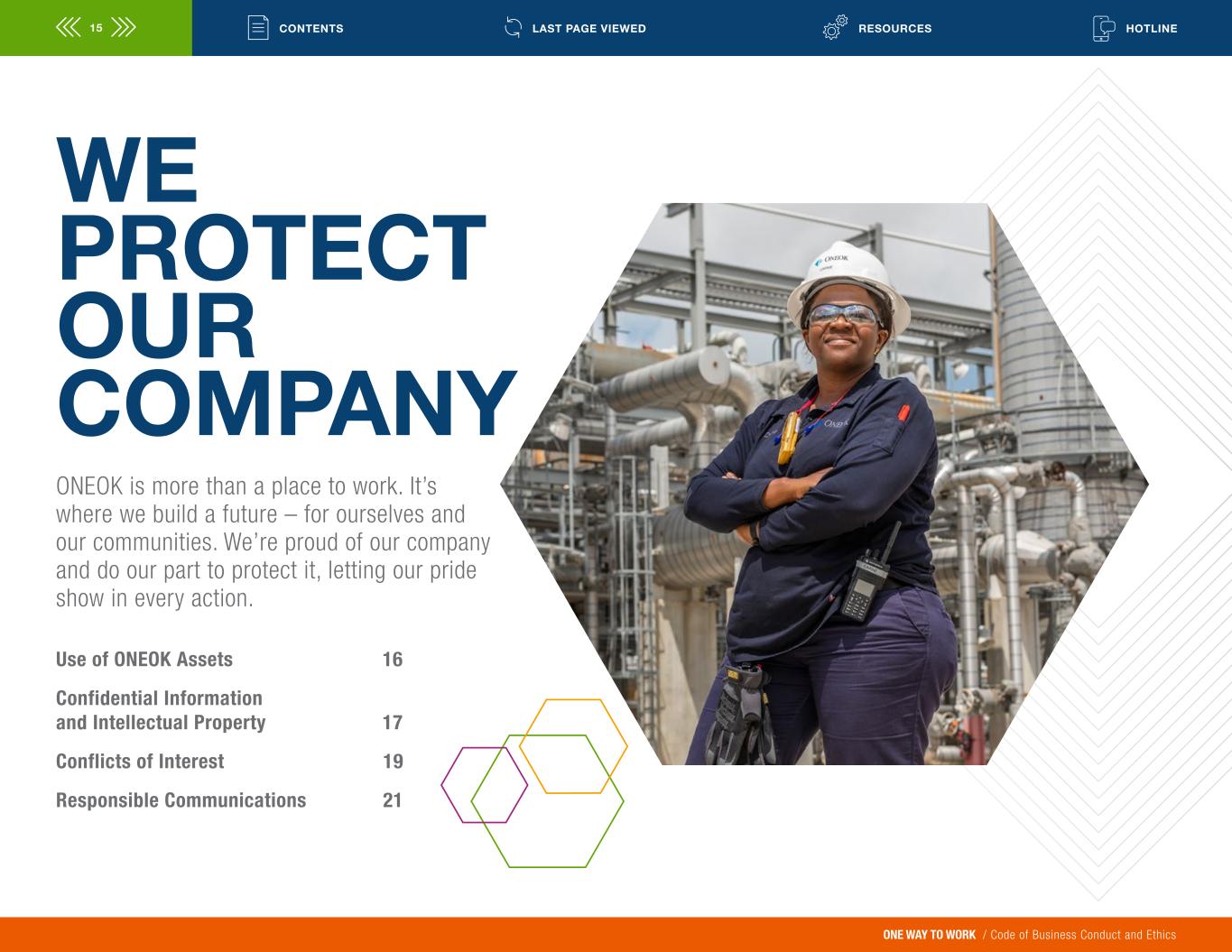 ONEOK is more than a place to work. It’s where we build a future – for ourselves and our communities. We’re proud of our company and do our part to protect it, letting our pride show in every action. Use of ONEOK Assets 16 Confidential Information and Intellectual Property 17 Conflicts of Interest 19 Responsible Communications 21 WE PROTECT OUR COMPANY 15 ONE WAY TO WORK / Code of Business Conduct and Ethics CONTENTS RESOURCES HOTLINELAST PAGE VIEWED