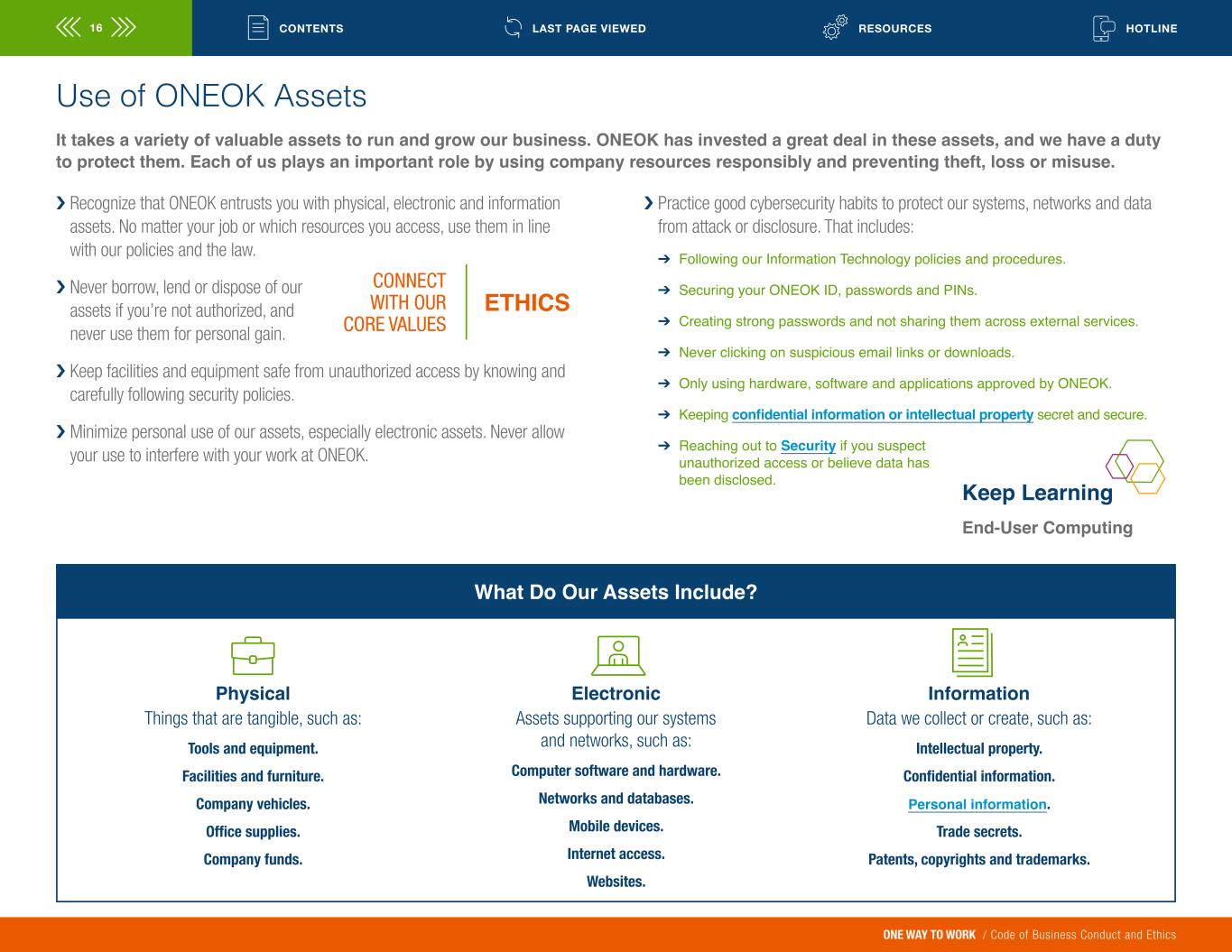 › Recognize that ONEOK entrusts you with physical, electronic and information assets. No matter your job or which resources you access, use them in line with our policies and the law. › Never borrow, lend or dispose of our assets if you’re not authorized, and never use them for personal gain. › Keep facilities and equipment safe from unauthorized access by knowing and carefully following security policies. › Minimize personal use of our assets, especially electronic assets. Never allow your use to interfere with your work at ONEOK. › Practice good cybersecurity habits to protect our systems, networks and data from attack or disclosure. That includes: ➔ Following our Information Technology policies and procedures. ➔ Securing your ONEOK ID, passwords and PINs. ➔ Creating strong passwords and not sharing them across external services. ➔ Never clicking on suspicious email links or downloads. ➔ Only using hardware, software and applications approved by ONEOK. ➔ Keeping confidential information or intellectual property secret and secure. ➔ Reaching out to Security if you suspect unauthorized access or believe data has been disclosed. Use of ONEOK Assets It takes a variety of valuable assets to run and grow our business. ONEOK has invested a great deal in these assets, and we have a duty to protect them. Each of us plays an important role by using company resources responsibly and preventing theft, loss or misuse. What Do Our Assets Include? Physical Things that are tangible, such as: Tools and equipment. Facilities and furniture. Company vehicles. Office supplies. Company funds. Electronic Assets supporting our systems and networks, such as: Computer software and hardware. Networks and databases. Mobile devices. Internet access. Websites. Information Data we collect or create, such as: Intellectual property. Confidential information. Personal information. Trade secrets. Patents, copyrights and trademarks. CONNECT WITH OUR CORE VALUES ETHICS Keep Learning End-User Computing 16 ONE WAY TO WORK / Code of Business Conduct and Ethics CONTENTS RESOURCES HOTLINELAST PAGE VIEWED