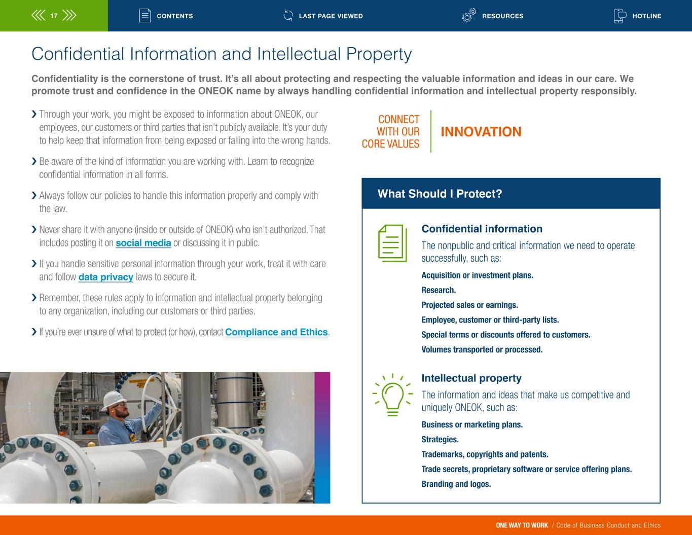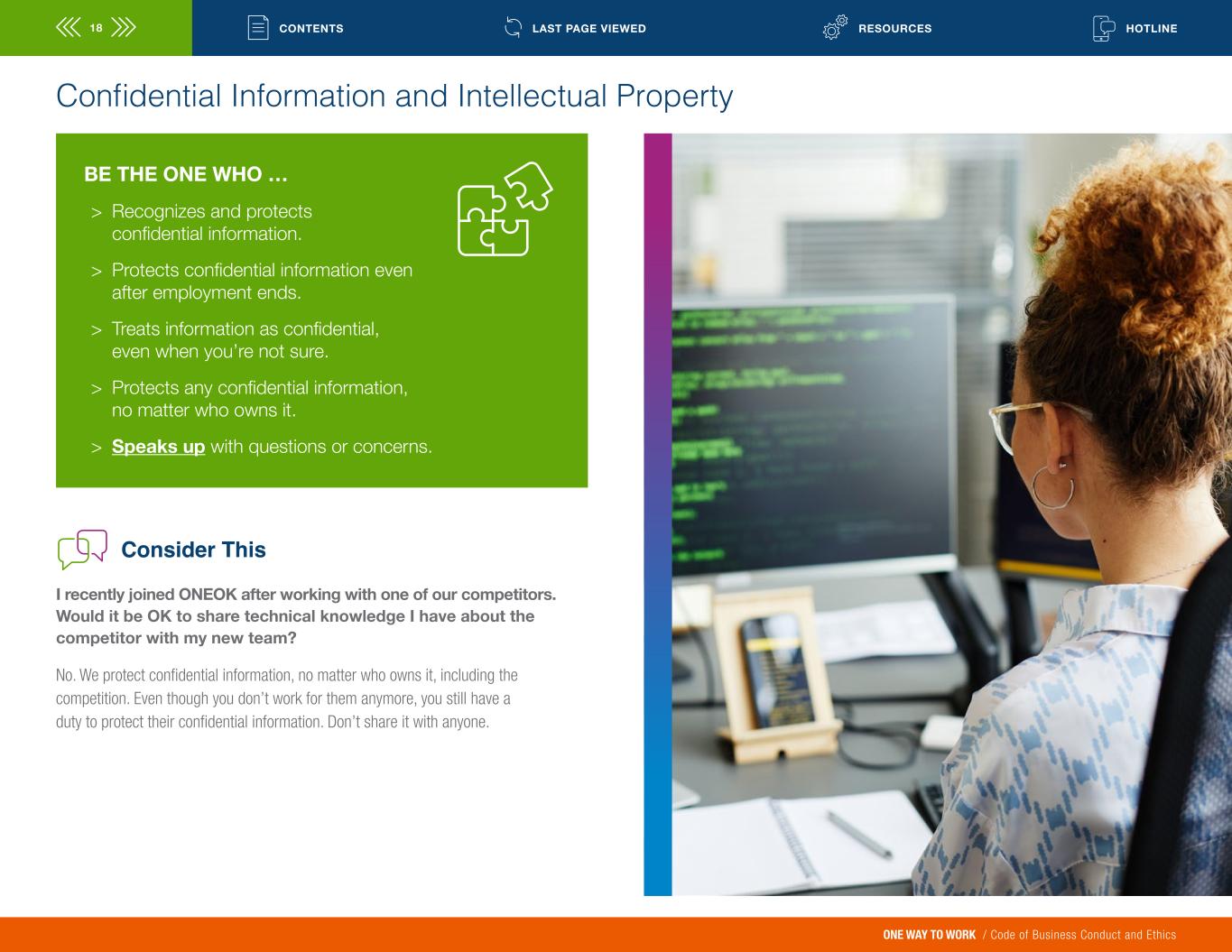 Confidential Information and Intellectual Property BE THE ONE WHO … > Recognizes and protects confidential information. > Protects confidential information even after employment ends. > Treats information as confidential, even when you’re not sure. > Protects any confidential information, no matter who owns it. > Speaks up with questions or concerns. Consider This I recently joined ONEOK after working with one of our competitors. Would it be OK to share technical knowledge I have about the competitor with my new team? No. We protect confidential information, no matter who owns it, including the competition. Even though you don’t work for them anymore, you still have a duty to protect their confidential information. Don’t share it with anyone. 18 ONE WAY TO WORK / Code of Business Conduct and Ethics CONTENTS RESOURCES HOTLINELAST PAGE VIEWED