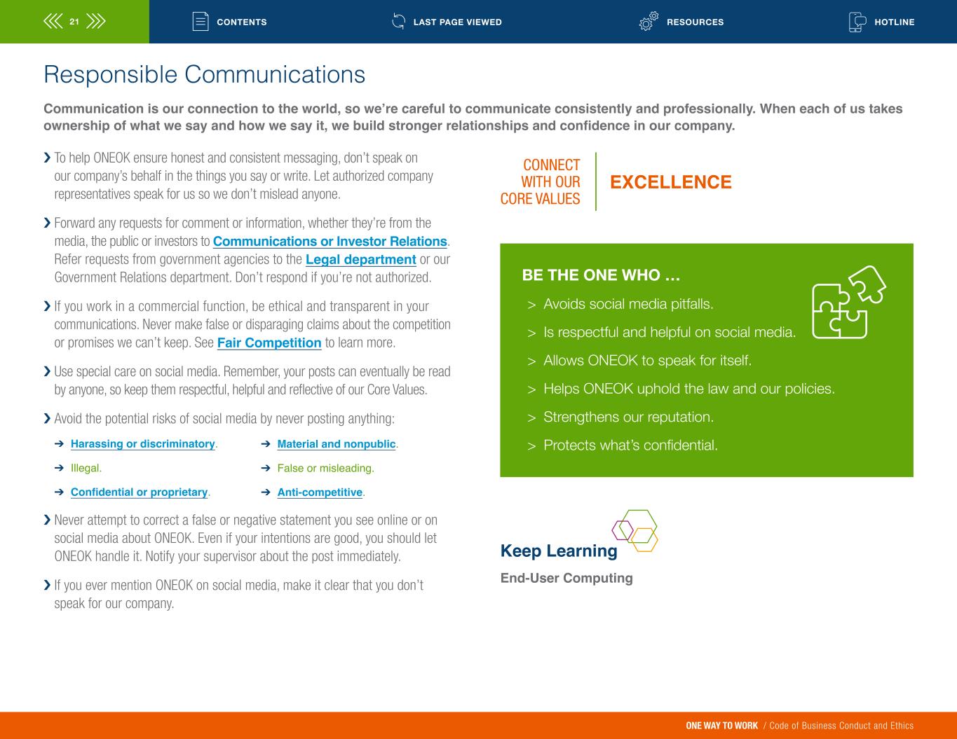 › To help ONEOK ensure honest and consistent messaging, don’t speak on our company’s behalf in the things you say or write. Let authorized company representatives speak for us so we don’t mislead anyone. › Forward any requests for comment or information, whether they’re from the media, the public or investors to Communications or Investor Relations. Refer requests from government agencies to the Legal department or our Government Relations department. Don’t respond if you’re not authorized. › If you work in a commercial function, be ethical and transparent in your communications. Never make false or disparaging claims about the competition or promises we can’t keep. See Fair Competition to learn more. › Use special care on social media. Remember, your posts can eventually be read by anyone, so keep them respectful, helpful and reflective of our Core Values. › Avoid the potential risks of social media by never posting anything: ➔ Harassing or discriminatory. ➔ Illegal. ➔ Confidential or proprietary. › Never attempt to correct a false or negative statement you see online or on social media about ONEOK. Even if your intentions are good, you should let ONEOK handle it. Notify your supervisor about the post immediately. › If you ever mention ONEOK on social media, make it clear that you don’t speak for our company. Responsible Communications Communication is our connection to the world, so we’re careful to communicate consistently and professionally. When each of us takes ownership of what we say and how we say it, we build stronger relationships and confidence in our company. CONNECT WITH OUR CORE VALUES EXCELLENCE BE THE ONE WHO … > Avoids social media pitfalls. > Is respectful and helpful on social media. > Allows ONEOK to speak for itself. > Helps ONEOK uphold the law and our policies. > Strengthens our reputation. > Protects what’s confidential. Keep Learning End-User Computing ➔ Material and nonpublic. ➔ False or misleading. ➔ Anti-competitive. 21 ONE WAY TO WORK / Code of Business Conduct and Ethics CONTENTS RESOURCES HOTLINELAST PAGE VIEWED