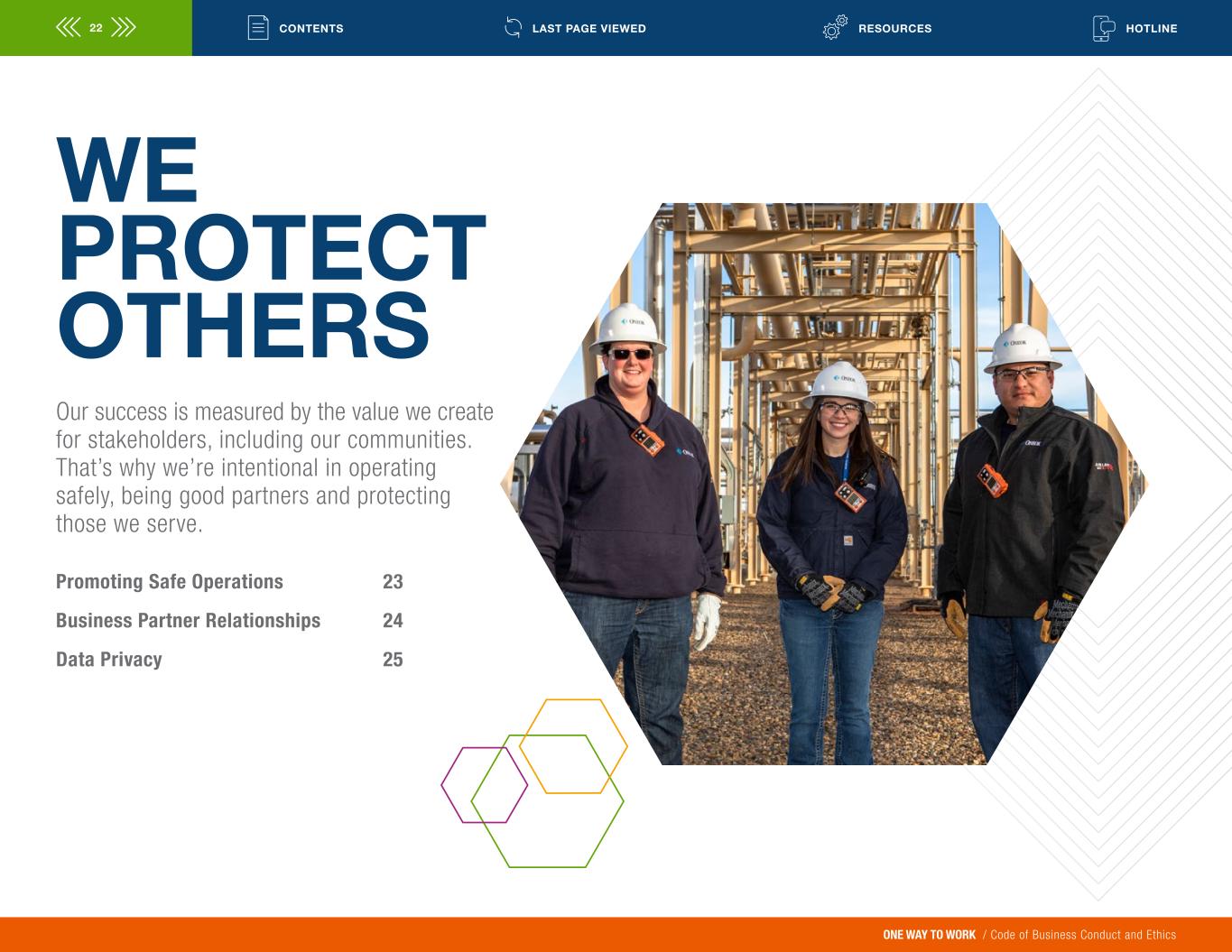 Our success is measured by the value we create for stakeholders, including our communities. That’s why we’re intentional in operating safely, being good partners and protecting those we serve. Promoting Safe Operations 23 Business Partner Relationships 24 Data Privacy 25 WE PROTECT OTHERS 22 ONE WAY TO WORK / Code of Business Conduct and Ethics CONTENTS RESOURCES HOTLINELAST PAGE VIEWED