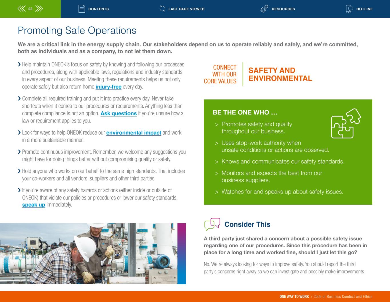 › Help maintain ONEOK’s focus on safety by knowing and following our processes and procedures, along with applicable laws, regulations and industry standards in every aspect of our business. Meeting these requirements helps us not only operate safely but also return home injury-free every day. › Complete all required training and put it into practice every day. Never take shortcuts when it comes to our procedures or requirements. Anything less than complete compliance is not an option. Ask questions if you’re unsure how a law or requirement applies to you. › Look for ways to help ONEOK reduce our environmental impact and work in a more sustainable manner. › Promote continuous improvement. Remember, we welcome any suggestions you might have for doing things better without compromising quality or safety. › Hold anyone who works on our behalf to the same high standards. That includes your co-workers and all vendors, suppliers and other third parties. › If you’re aware of any safety hazards or actions (either inside or outside of ONEOK) that violate our policies or procedures or lower our safety standards, speak up immediately. Promoting Safe Operations We are a critical link in the energy supply chain. Our stakeholders depend on us to operate reliably and safely, and we’re committed, both as individuals and as a company, to not let them down. Consider This A third party just shared a concern about a possible safety issue regarding one of our procedures. Since this procedure has been in place for a long time and worked fine, should I just let this go? No. We’re always looking for ways to improve safety. You should report the third party’s concerns right away so we can investigate and possibly make improvements. BE THE ONE WHO … > Promotes safety and quality throughout our business. > Uses stop-work authority when unsafe conditions or actions are observed. > Knows and communicates our safety standards. > Monitors and expects the best from our business suppliers. > Watches for and speaks up about safety issues. CONNECT WITH OUR CORE VALUES SAFETY AND ENVIRONMENTAL 23 ONE WAY TO WORK / Code of Business Conduct and Ethics CONTENTS RESOURCES HOTLINELAST PAGE VIEWED