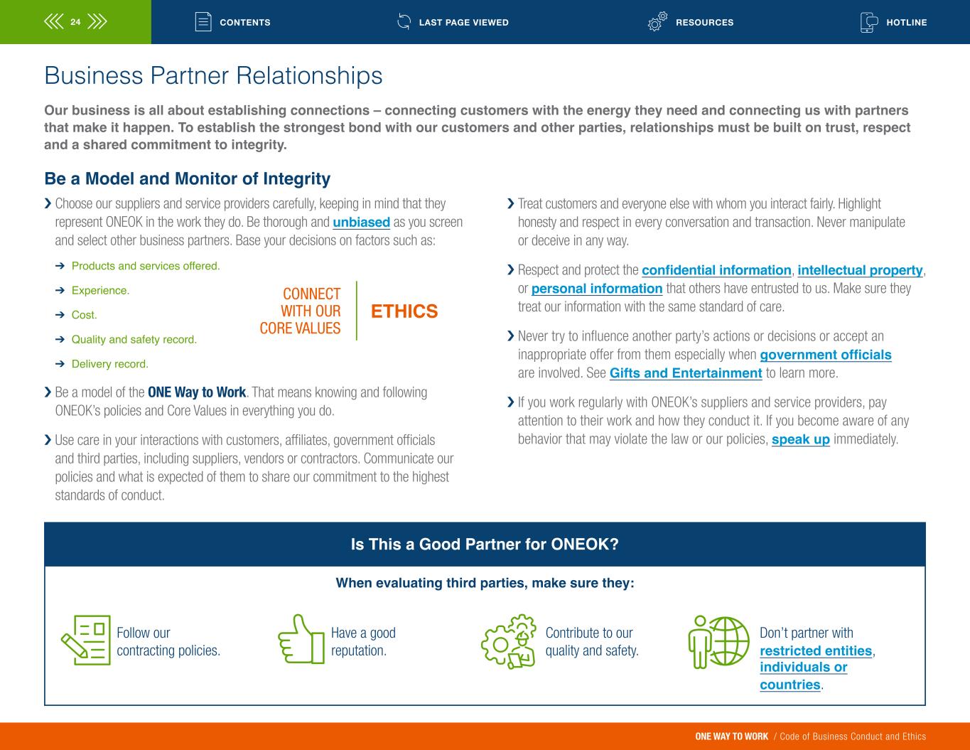 Business Partner Relationships Our business is all about establishing connections – connecting customers with the energy they need and connecting us with partners that make it happen. To establish the strongest bond with our customers and other parties, relationships must be built on trust, respect and a shared commitment to integrity. Be a Model and Monitor of Integrity › Choose our suppliers and service providers carefully, keeping in mind that they represent ONEOK in the work they do. Be thorough and unbiased as you screen and select other business partners. Base your decisions on factors such as: ➔ Products and services offered. ➔ Experience. ➔ Cost. ➔ Quality and safety record. ➔ Delivery record. › Be a model of the ONE Way to Work. That means knowing and following ONEOK’s policies and Core Values in everything you do. › Use care in your interactions with customers, affiliates, government officials and third parties, including suppliers, vendors or contractors. Communicate our policies and what is expected of them to share our commitment to the highest standards of conduct. › Treat customers and everyone else with whom you interact fairly. Highlight honesty and respect in every conversation and transaction. Never manipulate or deceive in any way. › Respect and protect the confidential information, intellectual property, or personal information that others have entrusted to us. Make sure they treat our information with the same standard of care. › Never try to influence another party’s actions or decisions or accept an inappropriate offer from them especially when government officials are involved. See Gifts and Entertainment to learn more. › If you work regularly with ONEOK’s suppliers and service providers, pay attention to their work and how they conduct it. If you become aware of any behavior that may violate the law or our policies, speak up immediately. Is This a Good Partner for ONEOK? Follow our contracting policies. Have a good reputation. Contribute to our quality and safety. Don’t partner with restricted entities, individuals or countries. When evaluating third parties, make sure they: CONNECT WITH OUR CORE VALUES ETHICS 24 ONE WAY TO WORK / Code of Business Conduct and Ethics CONTENTS RESOURCES HOTLINELAST PAGE VIEWED