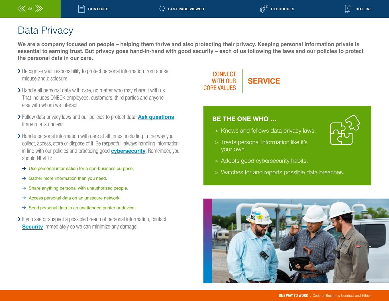 Data Privacy We are a company focused on people – helping them thrive and also protecting their privacy. Keeping personal information private is essential to earning trust. But privacy goes hand-in-hand with good security – each of us following the laws and our policies to protect the personal data in our care. › Recognize your responsibility to protect personal information from abuse, misuse and disclosure. › Handle all personal data with care, no matter who may share it with us. That includes ONEOK employees, customers, third parties and anyone else with whom we interact. › Follow data privacy laws and our policies to protect data. Ask questions if any rule is unclear. › Handle personal information with care at all times, including in the way you collect, access, store or dispose of it. Be respectful, always handling information in line with our policies and practicing good cybersecurity. Remember, you should NEVER: ➔ Use personal information for a non-business purpose. ➔ Gather more information than you need. ➔ Share anything personal with unauthorized people. ➔ Access personal data on an unsecure network. ➔ Send personal data to an unattended printer or device. › If you see or suspect a possible breach of personal information, contact Security immediately so we can minimize any damage. CONNECT WITH OUR CORE VALUES SERVICE BE THE ONE WHO … > Knows and follows data privacy laws. > Treats personal information like it’s your own. > Adopts good cybersecurity habits. > Watches for and reports possible data breaches. 25 ONE WAY TO WORK / Code of Business Conduct and Ethics CONTENTS RESOURCES HOTLINELAST PAGE VIEWED