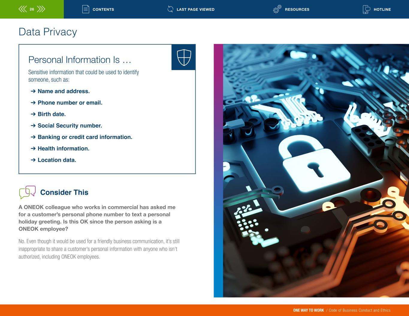 Data Privacy Personal Information Is … Sensitive information that could be used to identify someone, such as: ➔ Name and address. ➔ Phone number or email. ➔ Birth date. ➔ Social Security number. ➔ Banking or credit card information. ➔ Health information. ➔ Location data. Consider This A ONEOK colleague who works in commercial has asked me for a customer’s personal phone number to text a personal holiday greeting. Is this OK since the person asking is a ONEOK employee? No. Even though it would be used for a friendly business communication, it’s still inappropriate to share a customer’s personal information with anyone who isn’t authorized, including ONEOK employees. 26 ONE WAY TO WORK / Code of Business Conduct and Ethics CONTENTS RESOURCES HOTLINELAST PAGE VIEWED