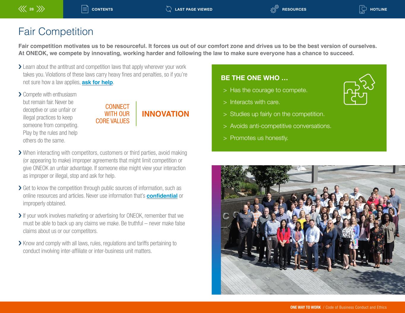 Fair Competition Fair competition motivates us to be resourceful. It forces us out of our comfort zone and drives us to be the best version of ourselves. At ONEOK, we compete by innovating, working harder and following the law to make sure everyone has a chance to succeed. › Learn about the antitrust and competition laws that apply wherever your work takes you. Violations of these laws carry heavy fines and penalties, so if you’re not sure how a law applies, ask for help. › Compete with enthusiasm but remain fair. Never be deceptive or use unfair or illegal practices to keep someone from competing. Play by the rules and help others do the same. › When interacting with competitors, customers or third parties, avoid making (or appearing to make) improper agreements that might limit competition or give ONEOK an unfair advantage. If someone else might view your interaction as improper or illegal, stop and ask for help. › Get to know the competition through public sources of information, such as online resources and articles. Never use information that’s confidential or improperly obtained. › If your work involves marketing or advertising for ONEOK, remember that we must be able to back up any claims we make. Be truthful – never make false claims about us or our competitors. › Know and comply with all laws, rules, regulations and tariffs pertaining to conduct involving inter-affiliate or inter-business unit matters. CONNECT WITH OUR CORE VALUES INNOVATION BE THE ONE WHO … > Has the courage to compete. > Interacts with care. > Studies up fairly on the competition. > Avoids anti-competitive conversations. > Promotes us honestly. 28 ONE WAY TO WORK / Code of Business Conduct and Ethics CONTENTS RESOURCES HOTLINELAST PAGE VIEWED