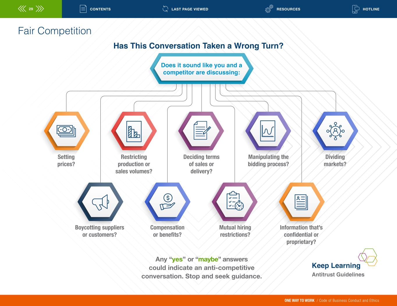 Has This Conversation Taken a Wrong Turn? Fair Competition Does it sound like you and a competitor are discussing: Setting prices? Boycotting suppliers or customers? Compensation or benefits? Mutual hiring restrictions? Information that’s confidential or proprietary? Restricting production or sales volumes? Deciding terms of sales or delivery? Dividing markets? Manipulating the bidding process? Any “yes” or “maybe” answers could indicate an anti-competitive conversation. Stop and seek guidance. Keep Learning Antitrust Guidelines 29 ONE WAY TO WORK / Code of Business Conduct and Ethics CONTENTS RESOURCES HOTLINELAST PAGE VIEWED