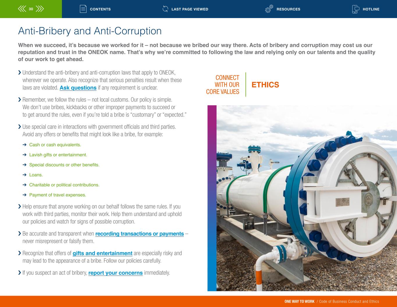 Anti-Bribery and Anti-Corruption When we succeed, it’s because we worked for it – not because we bribed our way there. Acts of bribery and corruption may cost us our reputation and trust in the ONEOK name. That’s why we’re committed to following the law and relying only on our talents and the quality of our work to get ahead. › Understand the anti-bribery and anti-corruption laws that apply to ONEOK, wherever we operate. Also recognize that serious penalties result when these laws are violated. Ask questions if any requirement is unclear. › Remember, we follow the rules – not local customs. Our policy is simple. We don’t use bribes, kickbacks or other improper payments to succeed or to get around the rules, even if you’re told a bribe is “customary” or “expected.” › Use special care in interactions with government officials and third parties. Avoid any offers or benefits that might look like a bribe, for example: ➔ Cash or cash equivalents. ➔ Lavish gifts or entertainment. ➔ Specialdiscountsorotherbenefits. ➔ Loans. ➔ Charitable or political contributions. ➔ Payment of travel expenses. › Help ensure that anyone working on our behalf follows the same rules. If you work with third parties, monitor their work. Help them understand and uphold our policies and watch for signs of possible corruption. › Be accurate and transparent when recording transactions or payments – never misrepresent or falsify them. › Recognize that offers of gifts and entertainment are especially risky and may lead to the appearance of a bribe. Follow our policies carefully. › If you suspect an act of bribery, report your concerns immediately. CONNECT WITH OUR CORE VALUES ETHICS 30 ONE WAY TO WORK / Code of Business Conduct and Ethics CONTENTS RESOURCES HOTLINELAST PAGE VIEWED