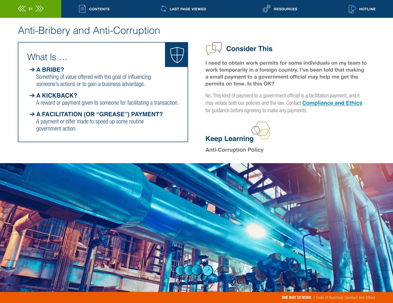 Anti-Bribery and Anti-Corruption What Is … ➔ A BRIBE? Something of value offered with the goal of influencing someone’s actions or to gain a business advantage. ➔ A KICKBACK? A reward or payment given to someone for facilitating a transaction. ➔ A FACILITATION (OR “GREASE”) PAYMENT? A payment or offer made to speed up some routine government action. Consider This I need to obtain work permits for some individuals on my team to work temporarily in a foreign country. I’ve been told that making a small payment to a government official may help me get the permits on time. Is this OK? No. This kind of payment to a government official is a facilitation payment, and it may violate both our policies and the law. Contact Compliance and Ethics for guidance before agreeing to make any payments. Keep Learning Anti-Corruption Policy 31 ONE WAY TO WORK / Code of Business Conduct and Ethics CONTENTS RESOURCES HOTLINELAST PAGE VIEWED