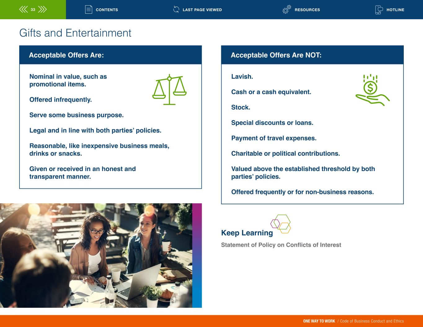 Gifts and Entertainment Acceptable Offers Are: Acceptable Offers Are NOT: Nominal in value, such as promotional items. Offered infrequently. Serve some business purpose. Legal and in line with both parties’ policies. Reasonable, like inexpensive business meals, drinks or snacks. Given or received in an honest and transparent manner. Lavish. Cash or a cash equivalent. Stock. Special discounts or loans. Payment of travel expenses. Charitable or political contributions. Valued above the established threshold by both parties’ policies. Offered frequently or for non-business reasons. Keep Learning Statement of Policy on Conflicts of Interest 33 ONE WAY TO WORK / Code of Business Conduct and Ethics CONTENTS RESOURCES HOTLINELAST PAGE VIEWED