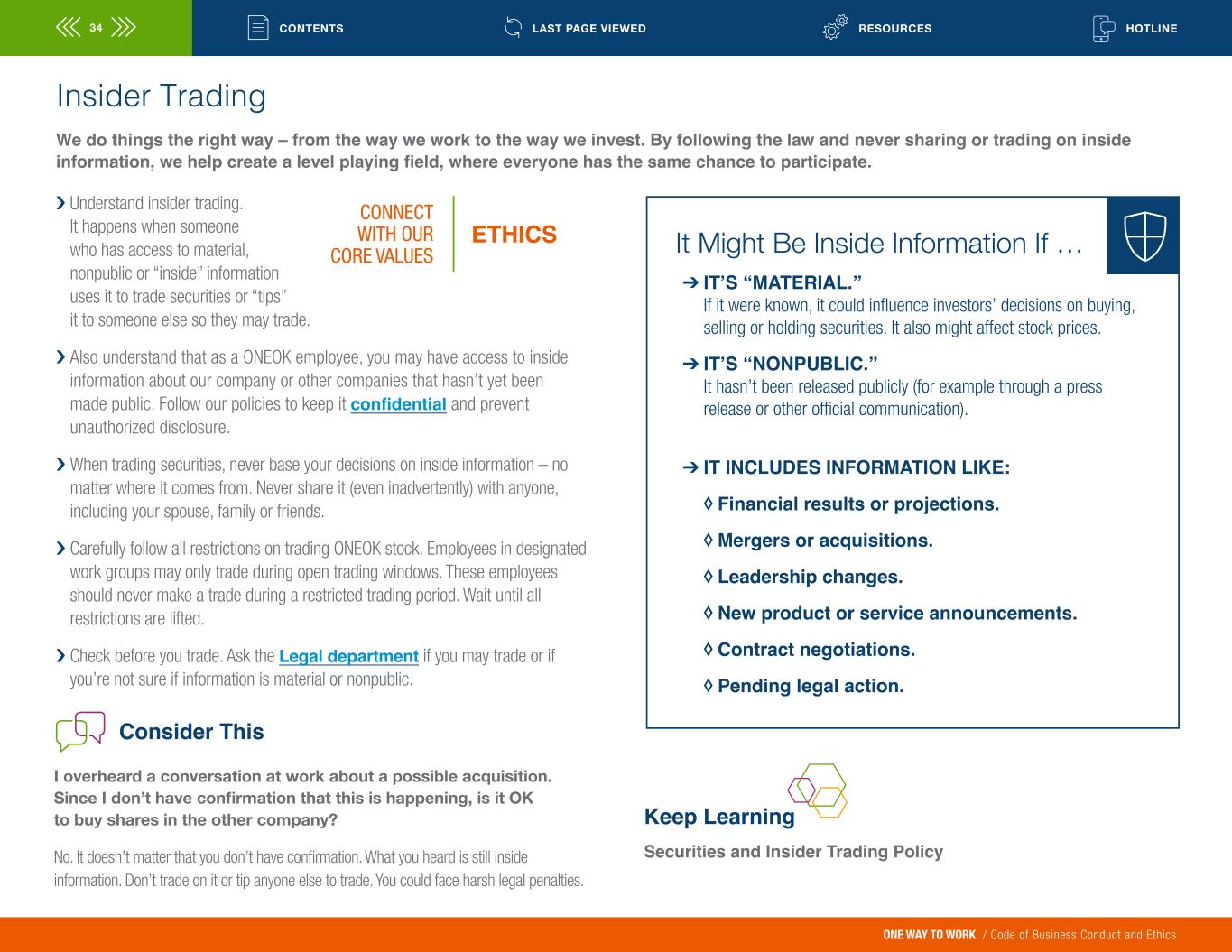 Insider Trading We do things the right way – from the way we work to the way we invest. By following the law and never sharing or trading on inside information, we help create a level playing field, where everyone has the same chance to participate. › Understand insider trading. It happens when someone who has access to material, nonpublic or “inside” information uses it to trade securities or “tips” it to someone else so they may trade. › Also understand that as a ONEOK employee, you may have access to inside information about our company or other companies that hasn’t yet been made public. Follow our policies to keep it confidential and prevent unauthorized disclosure. › When trading securities, never base your decisions on inside information – no matter where it comes from. Never share it (even inadvertently) with anyone, including your spouse, family or friends. › Carefully follow all restrictions on trading ONEOK stock. Employees in designated work groups may only trade during open trading windows. These employees should never make a trade during a restricted trading period. Wait until all restrictions are lifted. › Check before you trade. Ask the Legal department if you may trade or if you’re not sure if information is material or nonpublic. CONNECT WITH OUR CORE VALUES ETHICS Consider This I overheard a conversation at work about a possible acquisition. Since I don’t have confirmation that this is happening, is it OK to buy shares in the other company? No. It doesn’t matter that you don’t have confirmation. What you heard is still inside information. Don’t trade on it or tip anyone else to trade. You could face harsh legal penalties. Keep Learning Securities and Insider Trading Policy It Might Be Inside Information If … ➔ IT’S “MATERIAL.” If it were known, it could influence investors’ decisions on buying, selling or holding securities. It also might affect stock prices. ➔ IT’S “NONPUBLIC.” It hasn’t been released publicly (for example through a press release or other official communication). ➔ IT INCLUDES INFORMATION LIKE: ◊ Financial results or projections. ◊ Mergers or acquisitions. ◊ Leadership changes. ◊ New product or service announcements. ◊ Contract negotiations. ◊ Pending legal action. 34 ONE WAY TO WORK / Code of Business Conduct and Ethics CONTENTS RESOURCES HOTLINELAST PAGE VIEWED