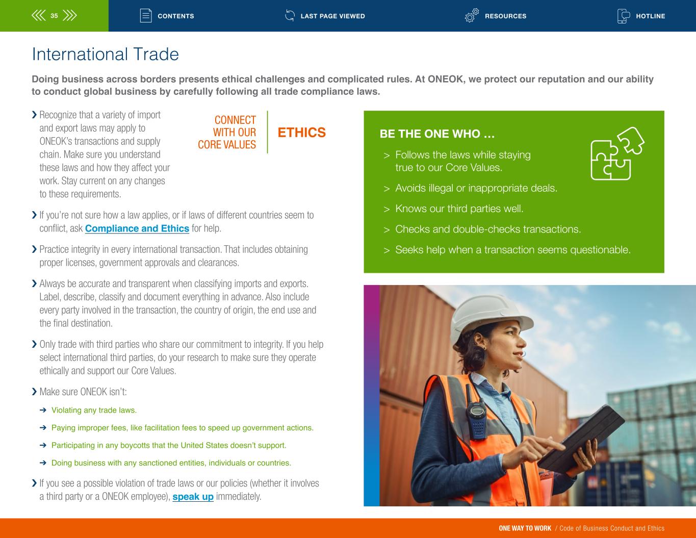 International Trade Doing business across borders presents ethical challenges and complicated rules. At ONEOK, we protect our reputation and our ability to conduct global business by carefully following all trade compliance laws. › Recognize that a variety of import and export laws may apply to ONEOK’s transactions and supply chain. Make sure you understand these laws and how they affect your work. Stay current on any changes to these requirements. › If you’re not sure how a law applies, or if laws of different countries seem to conflict, ask Compliance and Ethics for help. › Practice integrity in every international transaction. That includes obtaining proper licenses, government approvals and clearances. › Always be accurate and transparent when classifying imports and exports. Label, describe, classify and document everything in advance. Also include every party involved in the transaction, the country of origin, the end use and the final destination. › Only trade with third parties who share our commitment to integrity. If you help select international third parties, do your research to make sure they operate ethically and support our Core Values. › Make sure ONEOK isn’t: ➔ Violating any trade laws. ➔ Paying improper fees, like facilitation fees to speed up government actions. ➔ ParticipatinginanyboycottsthattheUnitedStatesdoesn’tsupport. ➔ Doing business with any sanctioned entities, individuals or countries. › If you see a possible violation of trade laws or our policies (whether it involves a third party or a ONEOK employee), speak up immediately. BE THE ONE WHO … > Follows the laws while staying true to our Core Values. > Avoids illegal or inappropriate deals. > Knows our third parties well. > Checks and double-checks transactions. > Seeks help when a transaction seems questionable. CONNECT WITH OUR CORE VALUES ETHICS 35 ONE WAY TO WORK / Code of Business Conduct and Ethics CONTENTS RESOURCES HOTLINELAST PAGE VIEWED