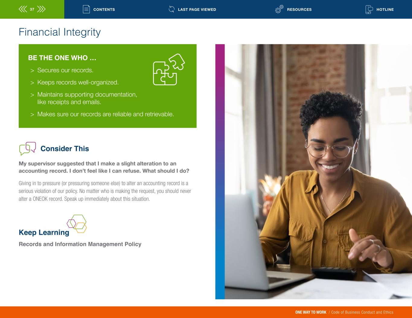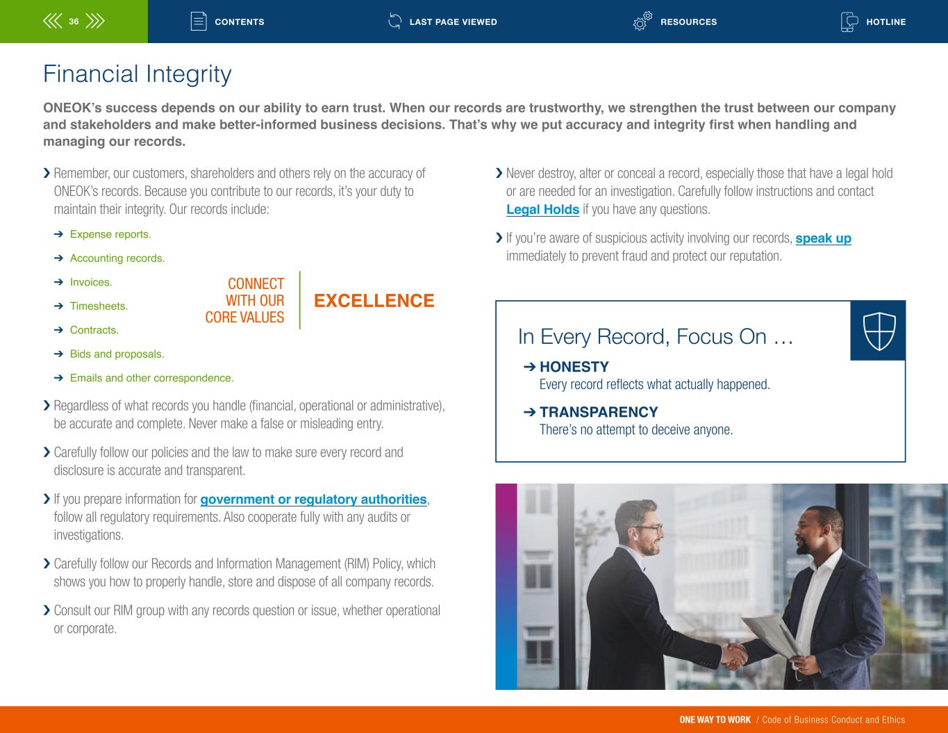 Financial Integrity BE THE ONE WHO … > Secures our records. > Keeps records well-organized. > Maintains supporting documentation, like receipts and emails. > Makes sure our records are reliable and retrievable. Consider This My supervisor suggested that I make a slight alteration to an accounting record. I don’t feel like I can refuse. What should I do? Giving in to pressure (or pressuring someone else) to alter an accounting record is a serious violation of our policy. No matter who is making the request, you should never alter a ONEOK record. Speak up immediately about this situation. Keep Learning Records and Information Management Policy 37 ONE WAY TO WORK / Code of Business Conduct and Ethics CONTENTS RESOURCES HOTLINELAST PAGE VIEWED