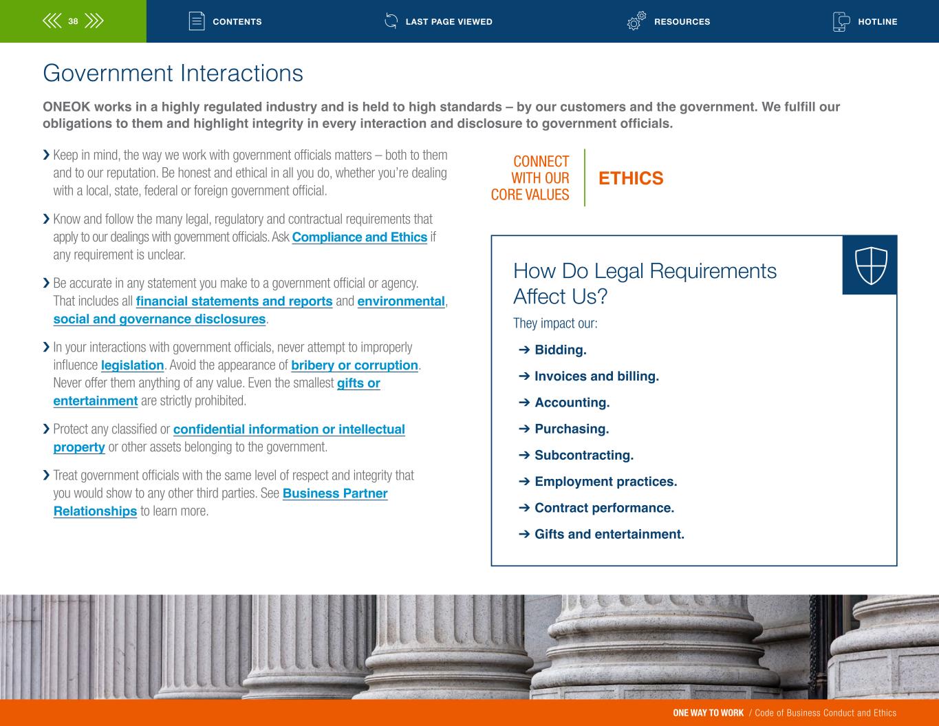 Government Interactions ONEOK works in a highly regulated industry and is held to high standards – by our customers and the government. We fulfill our obligations to them and highlight integrity in every interaction and disclosure to government officials. › Keep in mind, the way we work with government officials matters – both to them and to our reputation. Be honest and ethical in all you do, whether you’re dealing with a local, state, federal or foreign government official. › Know and follow the many legal, regulatory and contractual requirements that apply to our dealings with government officials. Ask Compliance and Ethics if any requirement is unclear. › Be accurate in any statement you make to a government official or agency. That includes all financial statements and reports and environmental, social and governance disclosures. › In your interactions with government officials, never attempt to improperly influence legislation. Avoid the appearance of bribery or corruption. Never offer them anything of any value. Even the smallest gifts or entertainment are strictly prohibited. › Protect any classified or confidential information or intellectual property or other assets belonging to the government. › Treat government officials with the same level of respect and integrity that you would show to any other third parties. See Business Partner Relationships to learn more. How Do Legal Requirements Affect Us? They impact our: ➔ Bidding. ➔ Invoices and billing. ➔ Accounting. ➔ Purchasing. ➔ Subcontracting. ➔ Employment practices. ➔ Contract performance. ➔ Gifts and entertainment. CONNECT WITH OUR CORE VALUES ETHICS 38 ONE WAY TO WORK / Code of Business Conduct and Ethics CONTENTS RESOURCES HOTLINELAST PAGE VIEWED