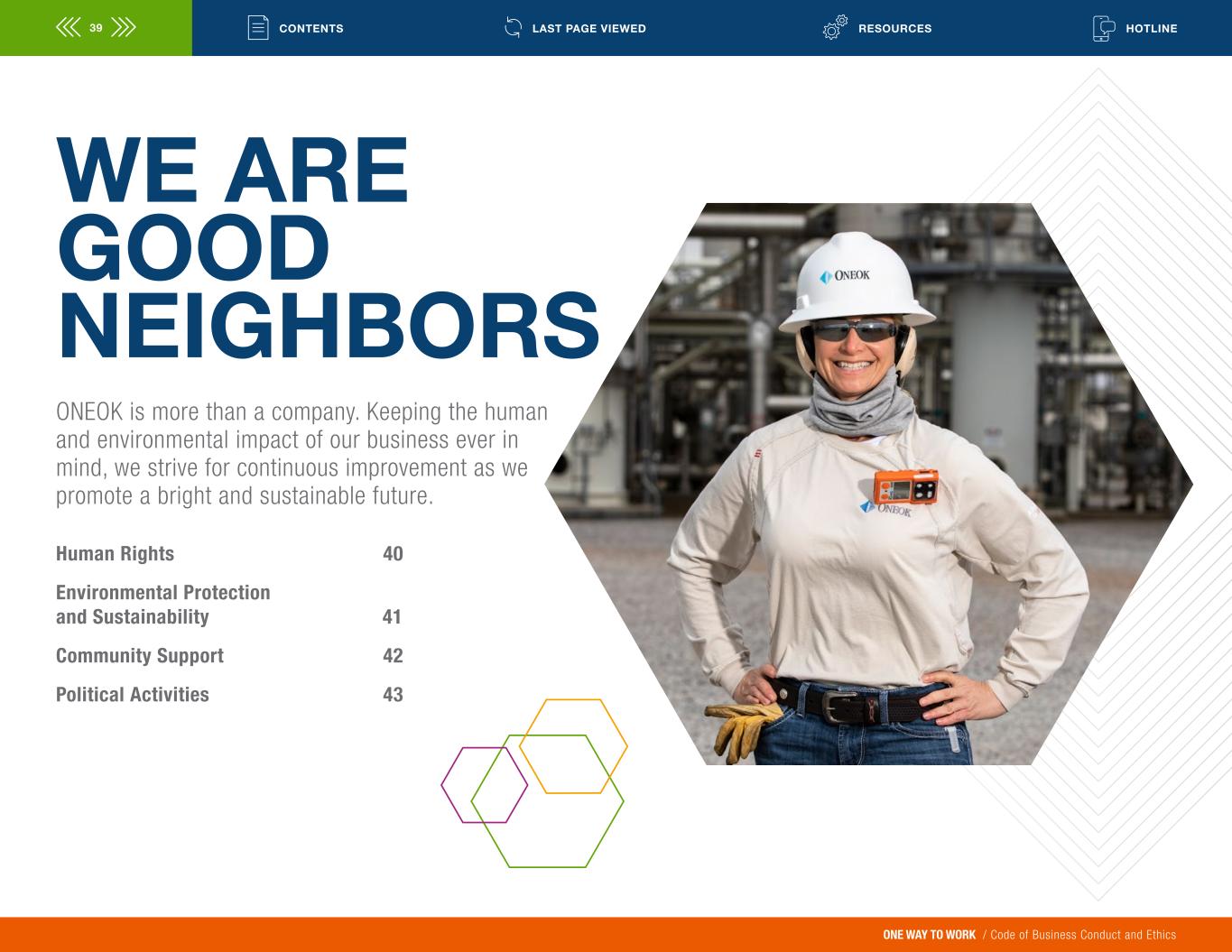ONEOK is more than a company. Keeping the human and environmental impact of our business ever in mind, we strive for continuous improvement as we promote a bright and sustainable future. Human Rights 40 Environmental Protection and Sustainability 41 Community Support 42 Political Activities 43 WE ARE GOOD NEIGHBORS 39 ONE WAY TO WORK / Code of Business Conduct and Ethics CONTENTS RESOURCES HOTLINELAST PAGE VIEWED
