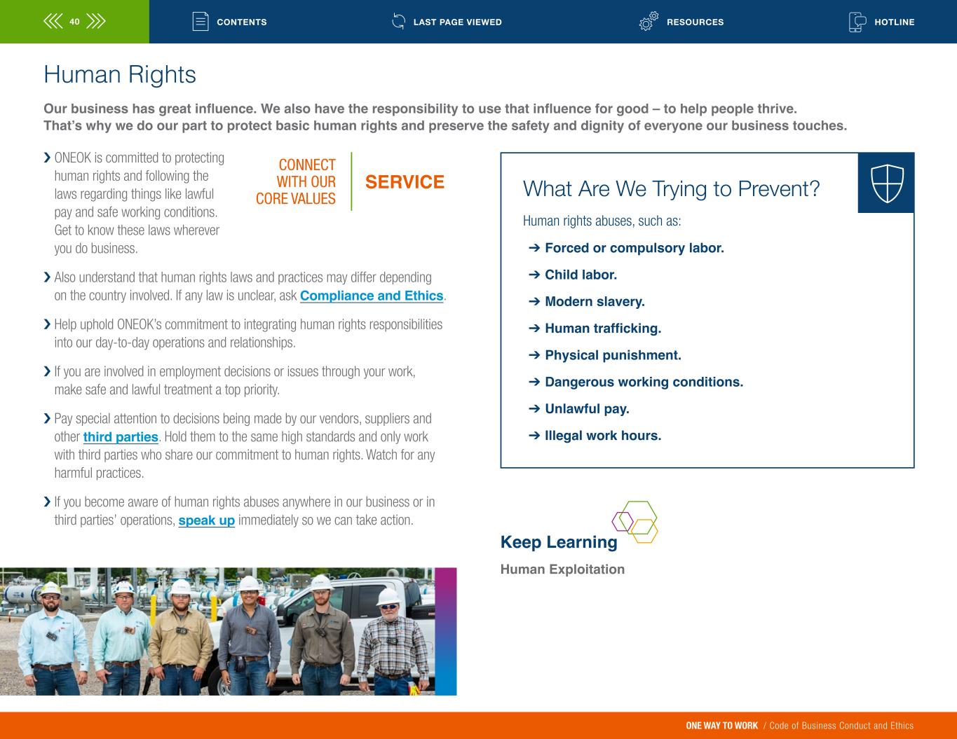 › ONEOK is committed to protecting human rights and following the laws regarding things like lawful pay and safe working conditions. Get to know these laws wherever you do business. › Also understand that human rights laws and practices may differ depending on the country involved. If any law is unclear, ask Compliance and Ethics. › Help uphold ONEOK’s commitment to integrating human rights responsibilities into our day-to-day operations and relationships. › If you are involved in employment decisions or issues through your work, make safe and lawful treatment a top priority. › Pay special attention to decisions being made by our vendors, suppliers and other third parties. Hold them to the same high standards and only work with third parties who share our commitment to human rights. Watch for any harmful practices. › If you become aware of human rights abuses anywhere in our business or in third parties’ operations, speak up immediately so we can take action. What Are We Trying to Prevent? Human rights abuses, such as: ➔ Forced or compulsory labor. ➔ Child labor. ➔ Modern slavery. ➔ Human trafficking. ➔ Physical punishment. ➔ Dangerous working conditions. ➔ Unlawful pay. ➔ Illegal work hours. CONNECT WITH OUR CORE VALUES SERVICE Human Rights Our business has great influence. We also have the responsibility to use that influence for good – to help people thrive. That’s why we do our part to protect basic human rights and preserve the safety and dignity of everyone our business touches. Keep Learning Human Exploitation 40 ONE WAY TO WORK / Code of Business Conduct and Ethics CONTENTS RESOURCES HOTLINELAST PAGE VIEWED