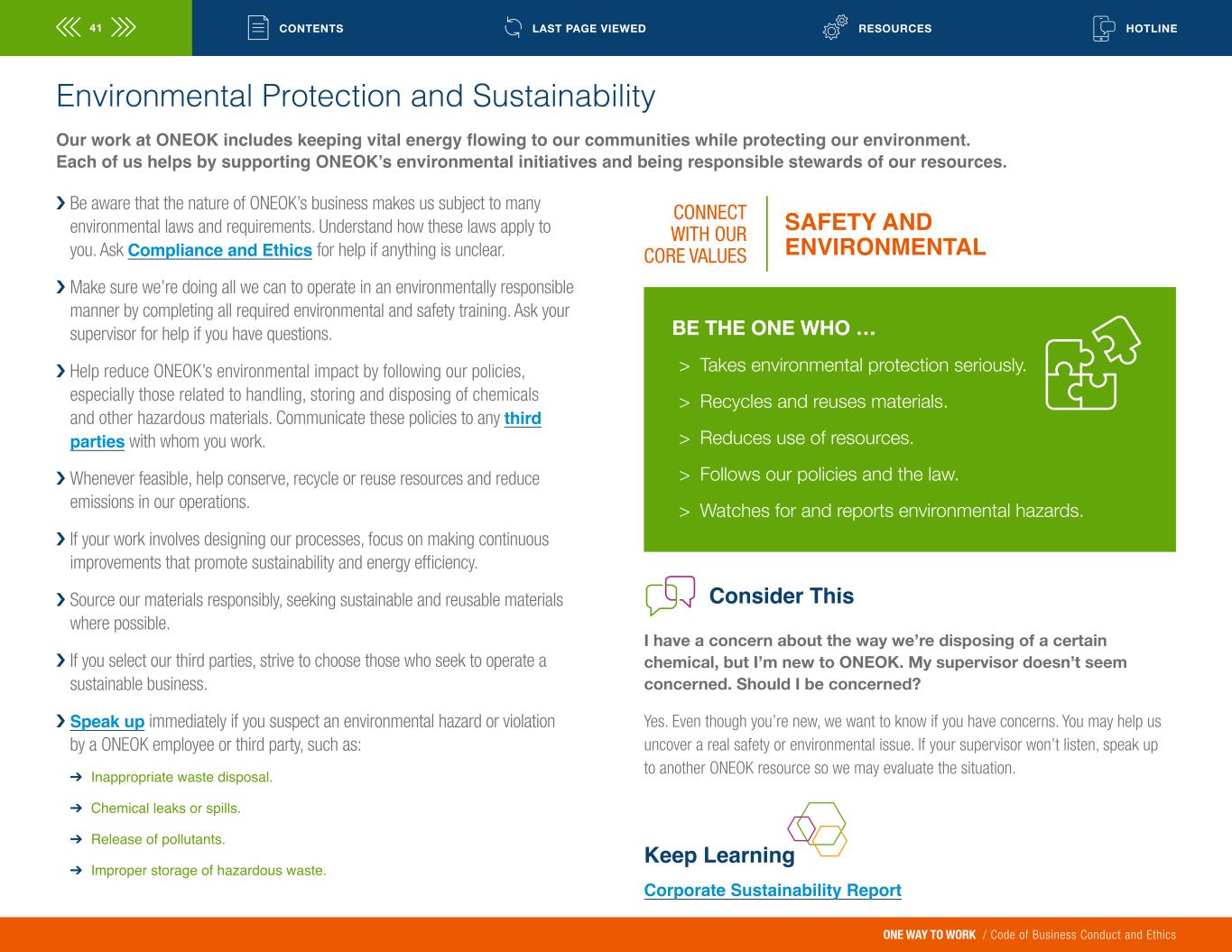Environmental Protection and Sustainability Our work at ONEOK includes keeping vital energy flowing to our communities while protecting our environment. Each of us helps by supporting ONEOK’s environmental initiatives and being responsible stewards of our resources. › Be aware that the nature of ONEOK’s business makes us subject to many environmental laws and requirements. Understand how these laws apply to you. Ask Compliance and Ethics for help if anything is unclear. › Make sure we’re doing all we can to operate in an environmentally responsible manner by completing all required environmental and safety training. Ask your supervisor for help if you have questions. › Help reduce ONEOK’s environmental impact by following our policies, especially those related to handling, storing and disposing of chemicals and other hazardous materials. Communicate these policies to any third parties with whom you work. › Whenever feasible, help conserve, recycle or reuse resources and reduce emissions in our operations. › If your work involves designing our processes, focus on making continuous improvements that promote sustainability and energy efficiency. › Source our materials responsibly, seeking sustainable and reusable materials where possible. › If you select our third parties, strive to choose those who seek to operate a sustainable business. › Speak up immediately if you suspect an environmental hazard or violation by a ONEOK employee or third party, such as: ➔ Inappropriate waste disposal. ➔ Chemical leaks or spills. ➔ Release of pollutants. ➔ Improper storage of hazardous waste. BE THE ONE WHO … > Takes environmental protection seriously. > Recycles and reuses materials. > Reduces use of resources. > Follows our policies and the law. > Watches for and reports environmental hazards. Consider This I have a concern about the way we’re disposing of a certain chemical, but I’m new to ONEOK. My supervisor doesn’t seem concerned. Should I be concerned? Yes. Even though you’re new, we want to know if you have concerns. You may help us uncover a real safety or environmental issue. If your supervisor won’t listen, speak up to another ONEOK resource so we may evaluate the situation. Keep Learning Corporate Sustainability Report CONNECT WITH OUR CORE VALUES SAFETY AND ENVIRONMENTAL 41 ONE WAY TO WORK / Code of Business Conduct and Ethics CONTENTS RESOURCES HOTLINELAST PAGE VIEWED