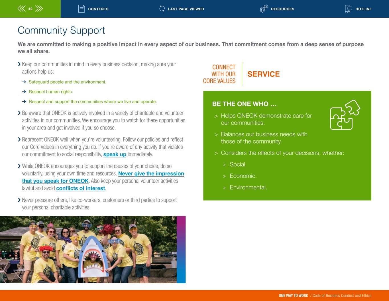 Community Support We are committed to making a positive impact in every aspect of our business. That commitment comes from a deep sense of purpose we all share. › Keep our communities in mind in every business decision, making sure your actions help us: ➔ Safeguard people and the environment. ➔ Respect human rights. ➔ Respect and support the communities where we live and operate. › Be aware that ONEOK is actively involved in a variety of charitable and volunteer activities in our communities. We encourage you to watch for these opportunities in your area and get involved if you so choose. › Represent ONEOK well when you’re volunteering. Follow our policies and reflect our Core Values in everything you do. If you’re aware of any activity that violates our commitment to social responsibility, speak up immediately. › While ONEOK encourages you to support the causes of your choice, do so voluntarily, using your own time and resources. Never give the impression that you speak for ONEOK. Also keep your personal volunteer activities lawful and avoid conflicts of interest. › Never pressure others, like co-workers, customers or third parties to support your personal charitable activities. BE THE ONE WHO … > Helps ONEOK demonstrate care for our communities. > Balances our business needs with those of the community. > Considers the effects of your decisions, whether: » Social. » Economic. » Environmental. CONNECT WITH OUR CORE VALUES SERVICE 42 ONE WAY TO WORK / Code of Business Conduct and Ethics CONTENTS RESOURCES HOTLINELAST PAGE VIEWED