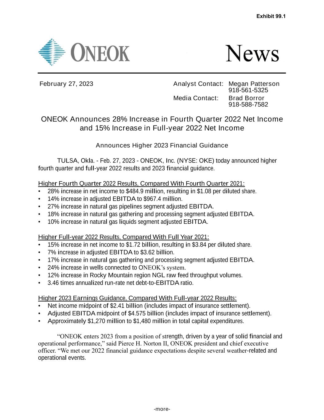 -more- February 27, 2023 Analyst Contact: Megan Patterson 918-561-5325 Media Contact: Brad Borror 918-588-7582 ONEOK Announces 28% Increase in Fourth Quarter 2022 Net Income and 15% Increase in Full-year 2022 Net Income Announces Higher 2023 Financial Guidance TULSA, Okla. - Feb. 27, 2023 - ONEOK, Inc. (NYSE: OKE) today announced higher fourth quarter and full-year 2022 results and 2023 financial guidance. Higher Fourth Quarter 2022 Results, Compared With Fourth Quarter 2021: • 28% increase in net income to $484.9 million, resulting in $1.08 per diluted share. • 14% increase in adjusted EBITDA to $967.4 million. • 27% increase in natural gas pipelines segment adjusted EBITDA. • 18% increase in natural gas gathering and processing segment adjusted EBITDA. • 10% increase in natural gas liquids segment adjusted EBITDA. Higher Full-year 2022 Results, Compared With Full Year 2021: • 15% increase in net income to $1.72 billion, resulting in $3.84 per diluted share. • 7% increase in adjusted EBITDA to $3.62 billion. • 17% increase in natural gas gathering and processing segment adjusted EBITDA. • 24% increase in wells connected to ONEOK’s system. • 12% increase in Rocky Mountain region NGL raw feed throughput volumes. • 3.46 times annualized run-rate net debt-to-EBITDA ratio. Higher 2023 Earnings Guidance, Compared With Full-year 2022 Results: • Net income midpoint of $2.41 billion (includes impact of insurance settlement). • Adjusted EBITDA midpoint of $4.575 billion (includes impact of insurance settlement). • Approximately $1,270 million to $1,480 million in total capital expenditures. “ONEOK enters 2023 from a position of strength, driven by a year of solid financial and operational performance,” said Pierce H. Norton II, ONEOK president and chief executive officer. “We met our 2022 financial guidance expectations despite several weather-related and operational events. Exhibit 99.1