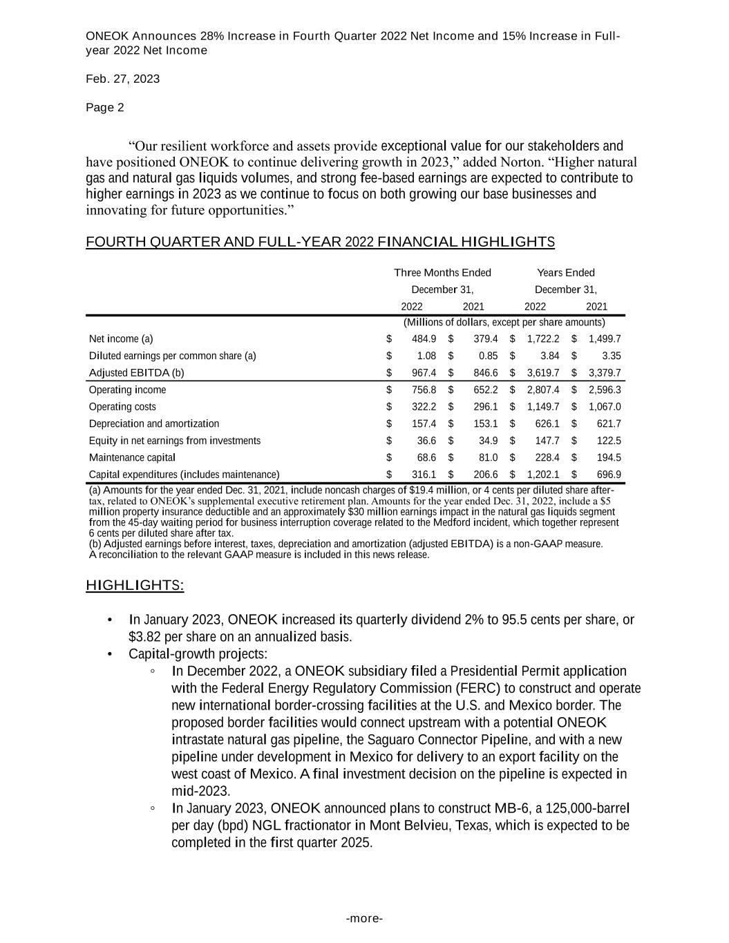 ONEOK Announces 28% Increase in Fourth Quarter 2022 Net Income and 15% Increase in Full- year 2022 Net Income Feb. 27, 2023 Page 2 -more- “Our resilient workforce and assets provide exceptional value for our stakeholders and have positioned ONEOK to continue delivering growth in 2023,” added Norton. “Higher natural gas and natural gas liquids volumes, and strong fee-based earnings are expected to contribute to higher earnings in 2023 as we continue to focus on both growing our base businesses and innovating for future opportunities.” FOURTH QUARTER AND FULL-YEAR 2022 FINANCIAL HIGHLIGHTS Three Months Ended Years Ended December 31, December 31, 2022 2021 2022 2021 (Millions of dollars, except per share amounts) Net income (a) $ 484.9 $ 379.4 $ 1,722.2 $ 1,499.7 Diluted earnings per common share (a) $ 1.08 $ 0.85 $ 3.84 $ 3.35 Adjusted EBITDA (b) $ 967.4 $ 846.6 $ 3,619.7 $ 3,379.7 Operating income $ 756.8 $ 652.2 $ 2,807.4 $ 2,596.3 Operating costs $ 322.2 $ 296.1 $ 1,149.7 $ 1,067.0 Depreciation and amortization $ 157.4 $ 153.1 $ 626.1 $ 621.7 Equity in net earnings from investments $ 36.6 $ 34.9 $ 147.7 $ 122.5 Maintenance capital $ 68.6 $ 81.0 $ 228.4 $ 194.5 Capital expenditures (includes maintenance) $ 316.1 $ 206.6 $ 1,202.1 $ 696.9 (a) Amounts for the year ended Dec. 31, 2021, include noncash charges of $19.4 million, or 4 cents per diluted share after- tax, related to ONEOK’s supplemental executive retirement plan. Amounts for the year ended Dec. 31, 2022, include a $5 million property insurance deductible and an approximately $30 million earnings impact in the natural gas liquids segment from the 45-day waiting period for business interruption coverage related to the Medford incident, which together represent 6 cents per diluted share after tax. (b) Adjusted earnings before interest, taxes, depreciation and amortization (adjusted EBITDA) is a non-GAAP measure. A reconciliation to the relevant GAAP measure is included in this news release. HIGHLIGHTS: • In January 2023, ONEOK increased its quarterly dividend 2% to 95.5 cents per share, or $3.82 per share on an annualized basis. • Capital-growth projects: ◦ In December 2022, a ONEOK subsidiary filed a Presidential Permit application with the Federal Energy Regulatory Commission (FERC) to construct and operate new international border-crossing facilities at the U.S. and Mexico border. The proposed border facilities would connect upstream with a potential ONEOK intrastate natural gas pipeline, the Saguaro Connector Pipeline, and with a new pipeline under development in Mexico for delivery to an export facility on the west coast of Mexico. A final investment decision on the pipeline is expected in mid-2023. ◦ In January 2023, ONEOK announced plans to construct MB-6, a 125,000-barrel per day (bpd) NGL fractionator in Mont Belvieu, Texas, which is expected to be completed in the first quarter 2025.