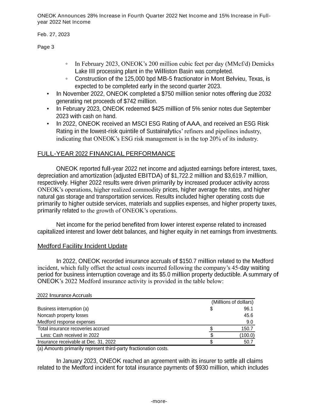 ONEOK Announces 28% Increase in Fourth Quarter 2022 Net Income and 15% Increase in Full- year 2022 Net Income Feb. 27, 2023 Page 3 -more- ◦ In February 2023, ONEOK’s 200 million cubic feet per day (MMcf/d) Demicks Lake III processing plant in the Williston Basin was completed. ◦ Construction of the 125,000 bpd MB-5 fractionator in Mont Belvieu, Texas, is expected to be completed early in the second quarter 2023. • In November 2022, ONEOK completed a $750 million senior notes offering due 2032 generating net proceeds of $742 million. • In February 2023, ONEOK redeemed $425 million of 5% senior notes due September 2023 with cash on hand. • In 2022, ONEOK received an MSCI ESG Rating of AAA, and received an ESG Risk Rating in the lowest-risk quintile of Sustainalytics’ refiners and pipelines industry, indicating that ONEOK’s ESG risk management is in the top 20% of its industry. FULL-YEAR 2022 FINANCIAL PERFORMANCE ONEOK reported full-year 2022 net income and adjusted earnings before interest, taxes, depreciation and amortization (adjusted EBITDA) of $1,722.2 million and $3,619.7 million, respectively. Higher 2022 results were driven primarily by increased producer activity across ONEOK’s operations, higher realized commodity prices, higher average fee rates, and higher natural gas storage and transportation services. Results included higher operating costs due primarily to higher outside services, materials and supplies expenses, and higher property taxes, primarily related to the growth of ONEOK’s operations. Net income for the period benefited from lower interest expense related to increased capitalized interest and lower debt balances, and higher equity in net earnings from investments. Medford Facility Incident Update In 2022, ONEOK recorded insurance accruals of $150.7 million related to the Medford incident, which fully offset the actual costs incurred following the company’s 45-day waiting period for business interruption coverage and its $5.0 million property deductible. A summary of ONEOK’s 2022 Medford insurance activity is provided in the table below: 2022 Insurance Accruals (Millions of dollars) Business interruption (a) $ 96.1 Noncash property losses 45.6 Medford response expenses 9.0 Total insurance recoveries accrued $ 150.7 Less: Cash received in 2022 $ (100.0) Insurance receivable at Dec. 31, 2022 $ 50.7 (a) Amounts primarily represent third-party fractionation costs. In January 2023, ONEOK reached an agreement with its insurer to settle all claims related to the Medford incident for total insurance payments of $930 million, which includes