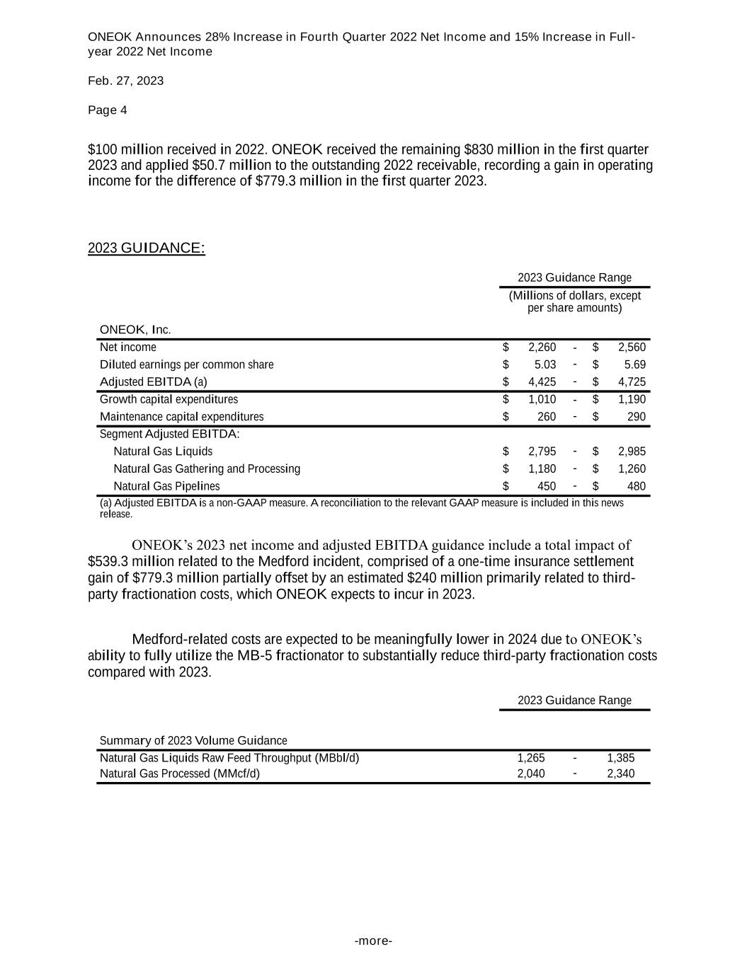 ONEOK Announces 28% Increase in Fourth Quarter 2022 Net Income and 15% Increase in Full- year 2022 Net Income Feb. 27, 2023 Page 4 -more- $100 million received in 2022. ONEOK received the remaining $830 million in the first quarter 2023 and applied $50.7 million to the outstanding 2022 receivable, recording a gain in operating income for the difference of $779.3 million in the first quarter 2023. 2023 GUIDANCE: 2023 Guidance Range (Millions of dollars, except per share amounts) ONEOK, Inc. Net income $ 2,260 - $ 2,560 Diluted earnings per common share $ 5.03 - $ 5.69 Adjusted EBITDA (a) $ 4,425 - $ 4,725 Growth capital expenditures $ 1,010 - $ 1,190 Maintenance capital expenditures $ 260 - $ 290 Segment Adjusted EBITDA: Natural Gas Liquids $ 2,795 - $ 2,985 Natural Gas Gathering and Processing $ 1,180 - $ 1,260 Natural Gas Pipelines $ 450 - $ 480 (a) Adjusted EBITDA is a non-GAAP measure. A reconciliation to the relevant GAAP measure is included in this news release. ONEOK’s 2023 net income and adjusted EBITDA guidance include a total impact of $539.3 million related to the Medford incident, comprised of a one-time insurance settlement gain of $779.3 million partially offset by an estimated $240 million primarily related to third- party fractionation costs, which ONEOK expects to incur in 2023. Medford-related costs are expected to be meaningfully lower in 2024 due to ONEOK’s ability to fully utilize the MB-5 fractionator to substantially reduce third-party fractionation costs compared with 2023. 2023 Guidance Range Summary of 2023 Volume Guidance Natural Gas Liquids Raw Feed Throughput (MBbl/d) 1,265 - 1,385 Natural Gas Processed (MMcf/d) 2,040 - 2,340