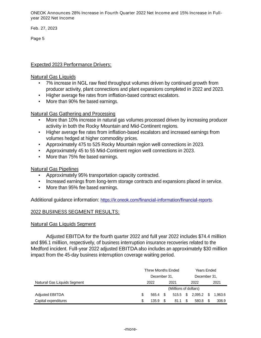 ONEOK Announces 28% Increase in Fourth Quarter 2022 Net Income and 15% Increase in Full- year 2022 Net Income Feb. 27, 2023 Page 5 -more- Expected 2023 Performance Drivers: Natural Gas Liquids • 7% increase in NGL raw feed throughput volumes driven by continued growth from producer activity, plant connections and plant expansions completed in 2022 and 2023. • Higher average fee rates from inflation-based contract escalators. • More than 90% fee based earnings. Natural Gas Gathering and Processing • More than 10% increase in natural gas volumes processed driven by increasing producer activity in both the Rocky Mountain and Mid-Continent regions. • Higher average fee rates from inflation-based escalators and increased earnings from volumes hedged at higher commodity prices. • Approximately 475 to 525 Rocky Mountain region well connections in 2023. • Approximately 45 to 55 Mid-Continent region well connections in 2023. • More than 75% fee based earnings. Natural Gas Pipelines • Approximately 95% transportation capacity contracted. • Increased earnings from long-term storage contracts and expansions placed in service. • More than 95% fee based earnings. Additional guidance information: https://ir.oneok.com/financial-information/financial-reports. 2022 BUSINESS SEGMENT RESULTS: Natural Gas Liquids Segment Adjusted EBITDA for the fourth quarter 2022 and full year 2022 includes $74.4 million and $96.1 million, respectively, of business interruption insurance recoveries related to the Medford incident. Full-year 2022 adjusted EBITDA also includes an approximately $30 million impact from the 45-day business interruption coverage waiting period. Three Months Ended Years Ended December 31, December 31, Natural Gas Liquids Segment 2022 2021 2022 2021 (Millions of dollars) Adjusted EBITDA $ 565.4 $ 515.5 $ 2,095.2 $ 1,963.6 Capital expenditures $ 135.9 $ 81.1 $ 580.8 $ 306.9