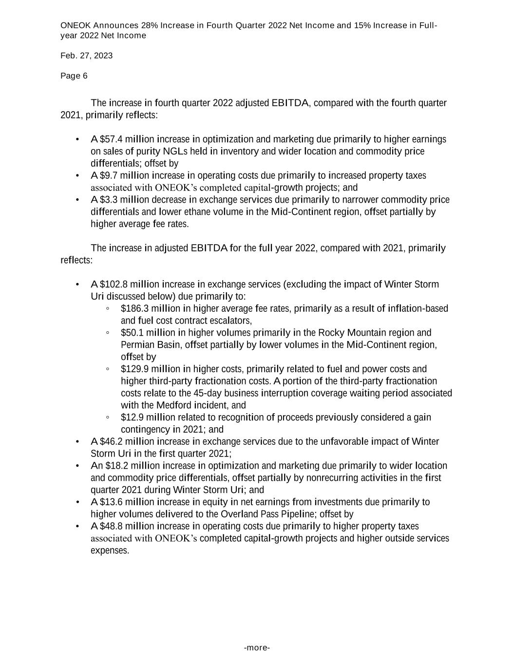 ONEOK Announces 28% Increase in Fourth Quarter 2022 Net Income and 15% Increase in Full- year 2022 Net Income Feb. 27, 2023 Page 6 -more- The increase in fourth quarter 2022 adjusted EBITDA, compared with the fourth quarter 2021, primarily reflects: • A $57.4 million increase in optimization and marketing due primarily to higher earnings on sales of purity NGLs held in inventory and wider location and commodity price differentials; offset by • A $9.7 million increase in operating costs due primarily to increased property taxes associated with ONEOK’s completed capital-growth projects; and • A $3.3 million decrease in exchange services due primarily to narrower commodity price differentials and lower ethane volume in the Mid-Continent region, offset partially by higher average fee rates. The increase in adjusted EBITDA for the full year 2022, compared with 2021, primarily reflects: • A $102.8 million increase in exchange services (excluding the impact of Winter Storm Uri discussed below) due primarily to: ◦ $186.3 million in higher average fee rates, primarily as a result of inflation-based and fuel cost contract escalators, ◦ $50.1 million in higher volumes primarily in the Rocky Mountain region and Permian Basin, offset partially by lower volumes in the Mid-Continent region, offset by ◦ $129.9 million in higher costs, primarily related to fuel and power costs and higher third-party fractionation costs. A portion of the third-party fractionation costs relate to the 45-day business interruption coverage waiting period associated with the Medford incident, and ◦ $12.9 million related to recognition of proceeds previously considered a gain contingency in 2021; and • A $46.2 million increase in exchange services due to the unfavorable impact of Winter Storm Uri in the first quarter 2021; • An $18.2 million increase in optimization and marketing due primarily to wider location and commodity price differentials, offset partially by nonrecurring activities in the first quarter 2021 during Winter Storm Uri; and • A $13.6 million increase in equity in net earnings from investments due primarily to higher volumes delivered to the Overland Pass Pipeline; offset by • A $48.8 million increase in operating costs due primarily to higher property taxes associated with ONEOK’s completed capital-growth projects and higher outside services expenses.