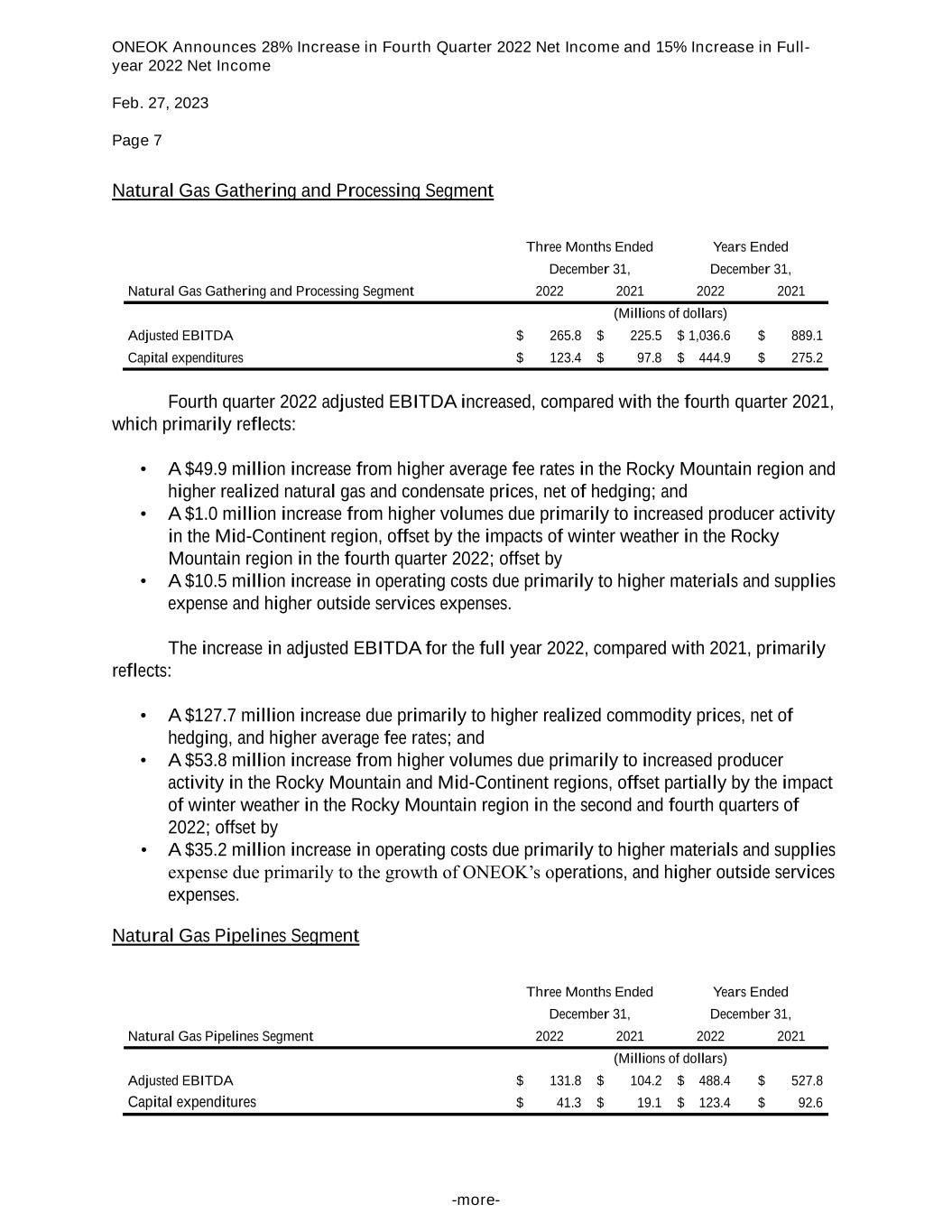 ONEOK Announces 28% Increase in Fourth Quarter 2022 Net Income and 15% Increase in Full- year 2022 Net Income Feb. 27, 2023 Page 7 -more- Natural Gas Gathering and Processing Segment Three Months Ended Years Ended December 31, December 31, Natural Gas Gathering and Processing Segment 2022 2021 2022 2021 (Millions of dollars) Adjusted EBITDA $ 265.8 $ 225.5 $ 1,036.6 $ 889.1 Capital expenditures $ 123.4 $ 97.8 $ 444.9 $ 275.2 Fourth quarter 2022 adjusted EBITDA increased, compared with the fourth quarter 2021, which primarily reflects: • A $49.9 million increase from higher average fee rates in the Rocky Mountain region and higher realized natural gas and condensate prices, net of hedging; and • A $1.0 million increase from higher volumes due primarily to increased producer activity in the Mid-Continent region, offset by the impacts of winter weather in the Rocky Mountain region in the fourth quarter 2022; offset by • A $10.5 million increase in operating costs due primarily to higher materials and supplies expense and higher outside services expenses. The increase in adjusted EBITDA for the full year 2022, compared with 2021, primarily reflects: • A $127.7 million increase due primarily to higher realized commodity prices, net of hedging, and higher average fee rates; and • A $53.8 million increase from higher volumes due primarily to increased producer activity in the Rocky Mountain and Mid-Continent regions, offset partially by the impact of winter weather in the Rocky Mountain region in the second and fourth quarters of 2022; offset by • A $35.2 million increase in operating costs due primarily to higher materials and supplies expense due primarily to the growth of ONEOK’s operations, and higher outside services expenses. Natural Gas Pipelines Segment Three Months Ended Years Ended December 31, December 31, Natural Gas Pipelines Segment 2022 2021 2022 2021 (Millions of dollars) Adjusted EBITDA $ 131.8 $ 104.2 $ 488.4 $ 527.8 Capital expenditures $ 41.3 $ 19.1 $ 123.4 $ 92.6