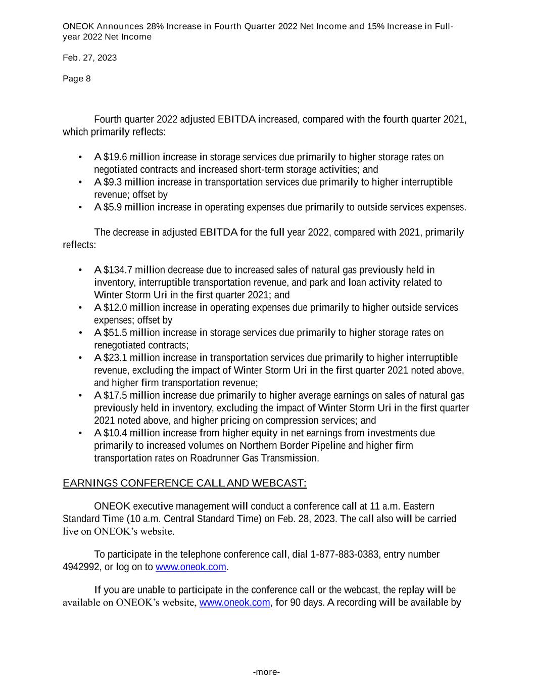 ONEOK Announces 28% Increase in Fourth Quarter 2022 Net Income and 15% Increase in Full- year 2022 Net Income Feb. 27, 2023 Page 8 -more- Fourth quarter 2022 adjusted EBITDA increased, compared with the fourth quarter 2021, which primarily reflects: • A $19.6 million increase in storage services due primarily to higher storage rates on negotiated contracts and increased short-term storage activities; and • A $9.3 million increase in transportation services due primarily to higher interruptible revenue; offset by • A $5.9 million increase in operating expenses due primarily to outside services expenses. The decrease in adjusted EBITDA for the full year 2022, compared with 2021, primarily reflects: • A $134.7 million decrease due to increased sales of natural gas previously held in inventory, interruptible transportation revenue, and park and loan activity related to Winter Storm Uri in the first quarter 2021; and • A $12.0 million increase in operating expenses due primarily to higher outside services expenses; offset by • A $51.5 million increase in storage services due primarily to higher storage rates on renegotiated contracts; • A $23.1 million increase in transportation services due primarily to higher interruptible revenue, excluding the impact of Winter Storm Uri in the first quarter 2021 noted above, and higher firm transportation revenue; • A $17.5 million increase due primarily to higher average earnings on sales of natural gas previously held in inventory, excluding the impact of Winter Storm Uri in the first quarter 2021 noted above, and higher pricing on compression services; and • A $10.4 million increase from higher equity in net earnings from investments due primarily to increased volumes on Northern Border Pipeline and higher firm transportation rates on Roadrunner Gas Transmission. EARNINGS CONFERENCE CALL AND WEBCAST: ONEOK executive management will conduct a conference call at 11 a.m. Eastern Standard Time (10 a.m. Central Standard Time) on Feb. 28, 2023. The call also will be carried live on ONEOK’s website. To participate in the telephone conference call, dial 1-877-883-0383, entry number 4942992, or log on to www.oneok.com. If you are unable to participate in the conference call or the webcast, the replay will be available on ONEOK’s website, www.oneok.com, for 90 days. A recording will be available by