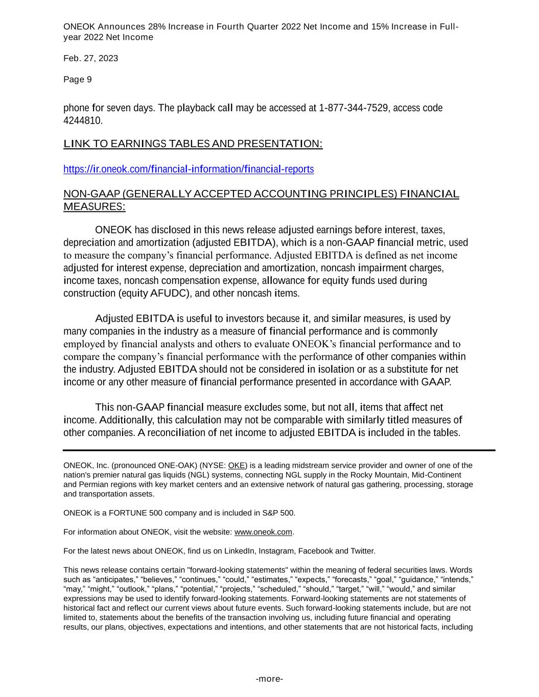 ONEOK Announces 28% Increase in Fourth Quarter 2022 Net Income and 15% Increase in Full- year 2022 Net Income Feb. 27, 2023 Page 9 -more- phone for seven days. The playback call may be accessed at 1-877-344-7529, access code 4244810. LINK TO EARNINGS TABLES AND PRESENTATION: https://ir.oneok.com/financial-information/financial-reports NON-GAAP (GENERALLY ACCEPTED ACCOUNTING PRINCIPLES) FINANCIAL MEASURES: ONEOK has disclosed in this news release adjusted earnings before interest, taxes, depreciation and amortization (adjusted EBITDA), which is a non-GAAP financial metric, used to measure the company’s financial performance. Adjusted EBITDA is defined as net income adjusted for interest expense, depreciation and amortization, noncash impairment charges, income taxes, noncash compensation expense, allowance for equity funds used during construction (equity AFUDC), and other noncash items. Adjusted EBITDA is useful to investors because it, and similar measures, is used by many companies in the industry as a measure of financial performance and is commonly employed by financial analysts and others to evaluate ONEOK’s financial performance and to compare the company’s financial performance with the performance of other companies within the industry. Adjusted EBITDA should not be considered in isolation or as a substitute for net income or any other measure of financial performance presented in accordance with GAAP. This non-GAAP financial measure excludes some, but not all, items that affect net income. Additionally, this calculation may not be comparable with similarly titled measures of other companies. A reconciliation of net income to adjusted EBITDA is included in the tables. ONEOK, Inc. (pronounced ONE-OAK) (NYSE: OKE) is a leading midstream service provider and owner of one of the nation's premier natural gas liquids (NGL) systems, connecting NGL supply in the Rocky Mountain, Mid-Continent and Permian regions with key market centers and an extensive network of natural gas gathering, processing, storage and transportation assets. ONEOK is a FORTUNE 500 company and is included in S&P 500. For information about ONEOK, visit the website: www.oneok.com. For the latest news about ONEOK, find us on LinkedIn, Instagram, Facebook and Twitter. This news release contains certain "forward-looking statements" within the meaning of federal securities laws. Words such as “anticipates,” “believes,” “continues,” “could,” “estimates,” “expects,” “forecasts,” “goal,” “guidance,” “intends,” “may,” “might,” “outlook,” “plans,” “potential,” “projects,” “scheduled,” “should,” “target,” “will,” “would,” and similar expressions may be used to identify forward-looking statements. Forward-looking statements are not statements of historical fact and reflect our current views about future events. Such forward-looking statements include, but are not limited to, statements about the benefits of the transaction involving us, including future financial and operating results, our plans, objectives, expectations and intentions, and other statements that are not historical facts, including