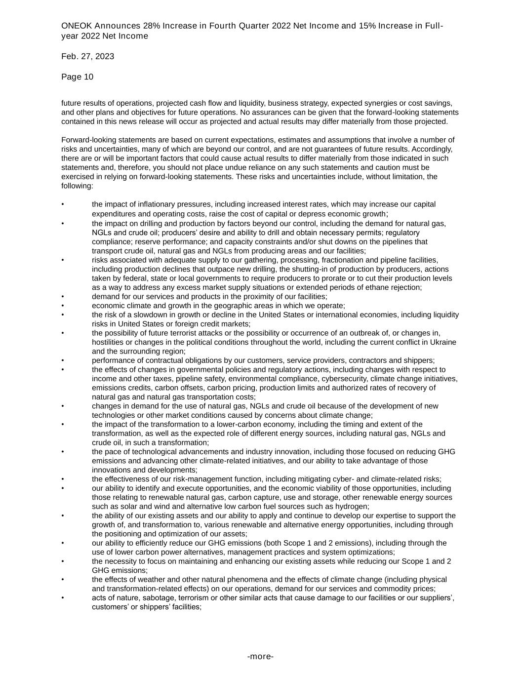 ONEOK Announces 28% Increase in Fourth Quarter 2022 Net Income and 15% Increase in Full- year 2022 Net Income Feb. 27, 2023 Page 10 -more- future results of operations, projected cash flow and liquidity, business strategy, expected synergies or cost savings, and other plans and objectives for future operations. No assurances can be given that the forward-looking statements contained in this news release will occur as projected and actual results may differ materially from those projected. Forward-looking statements are based on current expectations, estimates and assumptions that involve a number of risks and uncertainties, many of which are beyond our control, and are not guarantees of future results. Accordingly, there are or will be important factors that could cause actual results to differ materially from those indicated in such statements and, therefore, you should not place undue reliance on any such statements and caution must be exercised in relying on forward-looking statements. These risks and uncertainties include, without limitation, the following: • the impact of inflationary pressures, including increased interest rates, which may increase our capital expenditures and operating costs, raise the cost of capital or depress economic growth; • the impact on drilling and production by factors beyond our control, including the demand for natural gas, NGLs and crude oil; producers’ desire and ability to drill and obtain necessary permits; regulatory compliance; reserve performance; and capacity constraints and/or shut downs on the pipelines that transport crude oil, natural gas and NGLs from producing areas and our facilities; • risks associated with adequate supply to our gathering, processing, fractionation and pipeline facilities, including production declines that outpace new drilling, the shutting-in of production by producers, actions taken by federal, state or local governments to require producers to prorate or to cut their production levels as a way to address any excess market supply situations or extended periods of ethane rejection; • demand for our services and products in the proximity of our facilities; • economic climate and growth in the geographic areas in which we operate; • the risk of a slowdown in growth or decline in the United States or international economies, including liquidity risks in United States or foreign credit markets; • the possibility of future terrorist attacks or the possibility or occurrence of an outbreak of, or changes in, hostilities or changes in the political conditions throughout the world, including the current conflict in Ukraine and the surrounding region; • performance of contractual obligations by our customers, service providers, contractors and shippers; • the effects of changes in governmental policies and regulatory actions, including changes with respect to income and other taxes, pipeline safety, environmental compliance, cybersecurity, climate change initiatives, emissions credits, carbon offsets, carbon pricing, production limits and authorized rates of recovery of natural gas and natural gas transportation costs; • changes in demand for the use of natural gas, NGLs and crude oil because of the development of new technologies or other market conditions caused by concerns about climate change; • the impact of the transformation to a lower-carbon economy, including the timing and extent of the transformation, as well as the expected role of different energy sources, including natural gas, NGLs and crude oil, in such a transformation; • the pace of technological advancements and industry innovation, including those focused on reducing GHG emissions and advancing other climate-related initiatives, and our ability to take advantage of those innovations and developments; • the effectiveness of our risk-management function, including mitigating cyber- and climate-related risks; • our ability to identify and execute opportunities, and the economic viability of those opportunities, including those relating to renewable natural gas, carbon capture, use and storage, other renewable energy sources such as solar and wind and alternative low carbon fuel sources such as hydrogen; • the ability of our existing assets and our ability to apply and continue to develop our expertise to support the growth of, and transformation to, various renewable and alternative energy opportunities, including through the positioning and optimization of our assets; • our ability to efficiently reduce our GHG emissions (both Scope 1 and 2 emissions), including through the use of lower carbon power alternatives, management practices and system optimizations; • the necessity to focus on maintaining and enhancing our existing assets while reducing our Scope 1 and 2 GHG emissions; • the effects of weather and other natural phenomena and the effects of climate change (including physical and transformation-related effects) on our operations, demand for our services and commodity prices; • acts of nature, sabotage, terrorism or other similar acts that cause damage to our facilities or our suppliers’, customers’ or shippers’ facilities;