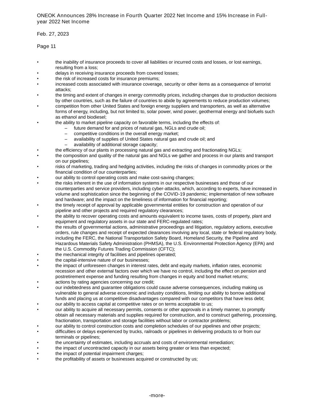 ONEOK Announces 28% Increase in Fourth Quarter 2022 Net Income and 15% Increase in Full- year 2022 Net Income Feb. 27, 2023 Page 11 -more- • the inability of insurance proceeds to cover all liabilities or incurred costs and losses, or lost earnings, resulting from a loss; • delays in receiving insurance proceeds from covered losses; • the risk of increased costs for insurance premiums; • increased costs associated with insurance coverage, security or other items as a consequence of terrorist attacks; • the timing and extent of changes in energy commodity prices, including changes due to production decisions by other countries, such as the failure of countries to abide by agreements to reduce production volumes; • competition from other United States and foreign energy suppliers and transporters, as well as alternative forms of energy, including, but not limited to, solar power, wind power, geothermal energy and biofuels such as ethanol and biodiesel; • the ability to market pipeline capacity on favorable terms, including the effects of: – future demand for and prices of natural gas, NGLs and crude oil; – competitive conditions in the overall energy market; – availability of supplies of United States natural gas and crude oil; and – availability of additional storage capacity; • the efficiency of our plants in processing natural gas and extracting and fractionating NGLs; • the composition and quality of the natural gas and NGLs we gather and process in our plants and transport on our pipelines; • risks of marketing, trading and hedging activities, including the risks of changes in commodity prices or the financial condition of our counterparties; • our ability to control operating costs and make cost-saving changes; • the risks inherent in the use of information systems in our respective businesses and those of our counterparties and service providers, including cyber-attacks, which, according to experts, have increased in volume and sophistication since the beginning of the COVID-19 pandemic; implementation of new software and hardware; and the impact on the timeliness of information for financial reporting; • the timely receipt of approval by applicable governmental entities for construction and operation of our pipeline and other projects and required regulatory clearances; • the ability to recover operating costs and amounts equivalent to income taxes, costs of property, plant and equipment and regulatory assets in our state and FERC-regulated rates; • the results of governmental actions, administrative proceedings and litigation, regulatory actions, executive orders, rule changes and receipt of expected clearances involving any local, state or federal regulatory body, including the FERC, the National Transportation Safety Board, Homeland Security, the Pipeline and Hazardous Materials Safety Administration (PHMSA), the U.S. Environmental Protection Agency (EPA) and the U.S. Commodity Futures Trading Commission (CFTC); • the mechanical integrity of facilities and pipelines operated; • the capital-intensive nature of our businesses; • the impact of unforeseen changes in interest rates, debt and equity markets, inflation rates, economic recession and other external factors over which we have no control, including the effect on pension and postretirement expense and funding resulting from changes in equity and bond market returns; • actions by rating agencies concerning our credit; • our indebtedness and guarantee obligations could cause adverse consequences, including making us vulnerable to general adverse economic and industry conditions, limiting our ability to borrow additional funds and placing us at competitive disadvantages compared with our competitors that have less debt; • our ability to access capital at competitive rates or on terms acceptable to us; • our ability to acquire all necessary permits, consents or other approvals in a timely manner, to promptly obtain all necessary materials and supplies required for construction, and to construct gathering, processing, fractionation, transportation and storage facilities without labor or contractor problems; • our ability to control construction costs and completion schedules of our pipelines and other projects; • difficulties or delays experienced by trucks, railroads or pipelines in delivering products to or from our terminals or pipelines; • the uncertainty of estimates, including accruals and costs of environmental remediation; • the impact of uncontracted capacity in our assets being greater or less than expected; • the impact of potential impairment charges; • the profitability of assets or businesses acquired or constructed by us;