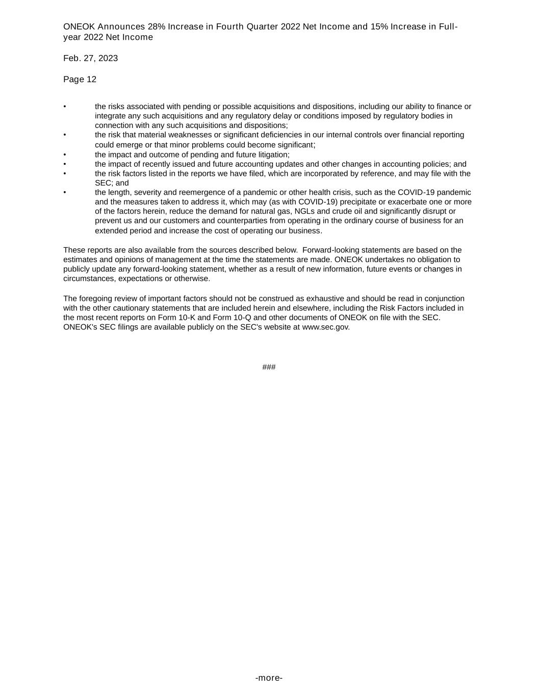 ONEOK Announces 28% Increase in Fourth Quarter 2022 Net Income and 15% Increase in Full- year 2022 Net Income Feb. 27, 2023 Page 12 -more- • the risks associated with pending or possible acquisitions and dispositions, including our ability to finance or integrate any such acquisitions and any regulatory delay or conditions imposed by regulatory bodies in connection with any such acquisitions and dispositions; • the risk that material weaknesses or significant deficiencies in our internal controls over financial reporting could emerge or that minor problems could become significant; • the impact and outcome of pending and future litigation; • the impact of recently issued and future accounting updates and other changes in accounting policies; and • the risk factors listed in the reports we have filed, which are incorporated by reference, and may file with the SEC; and • the length, severity and reemergence of a pandemic or other health crisis, such as the COVID-19 pandemic and the measures taken to address it, which may (as with COVID-19) precipitate or exacerbate one or more of the factors herein, reduce the demand for natural gas, NGLs and crude oil and significantly disrupt or prevent us and our customers and counterparties from operating in the ordinary course of business for an extended period and increase the cost of operating our business. These reports are also available from the sources described below. Forward-looking statements are based on the estimates and opinions of management at the time the statements are made. ONEOK undertakes no obligation to publicly update any forward-looking statement, whether as a result of new information, future events or changes in circumstances, expectations or otherwise. The foregoing review of important factors should not be construed as exhaustive and should be read in conjunction with the other cautionary statements that are included herein and elsewhere, including the Risk Factors included in the most recent reports on Form 10-K and Form 10-Q and other documents of ONEOK on file with the SEC. ONEOK's SEC filings are available publicly on the SEC's website at www.sec.gov. ###