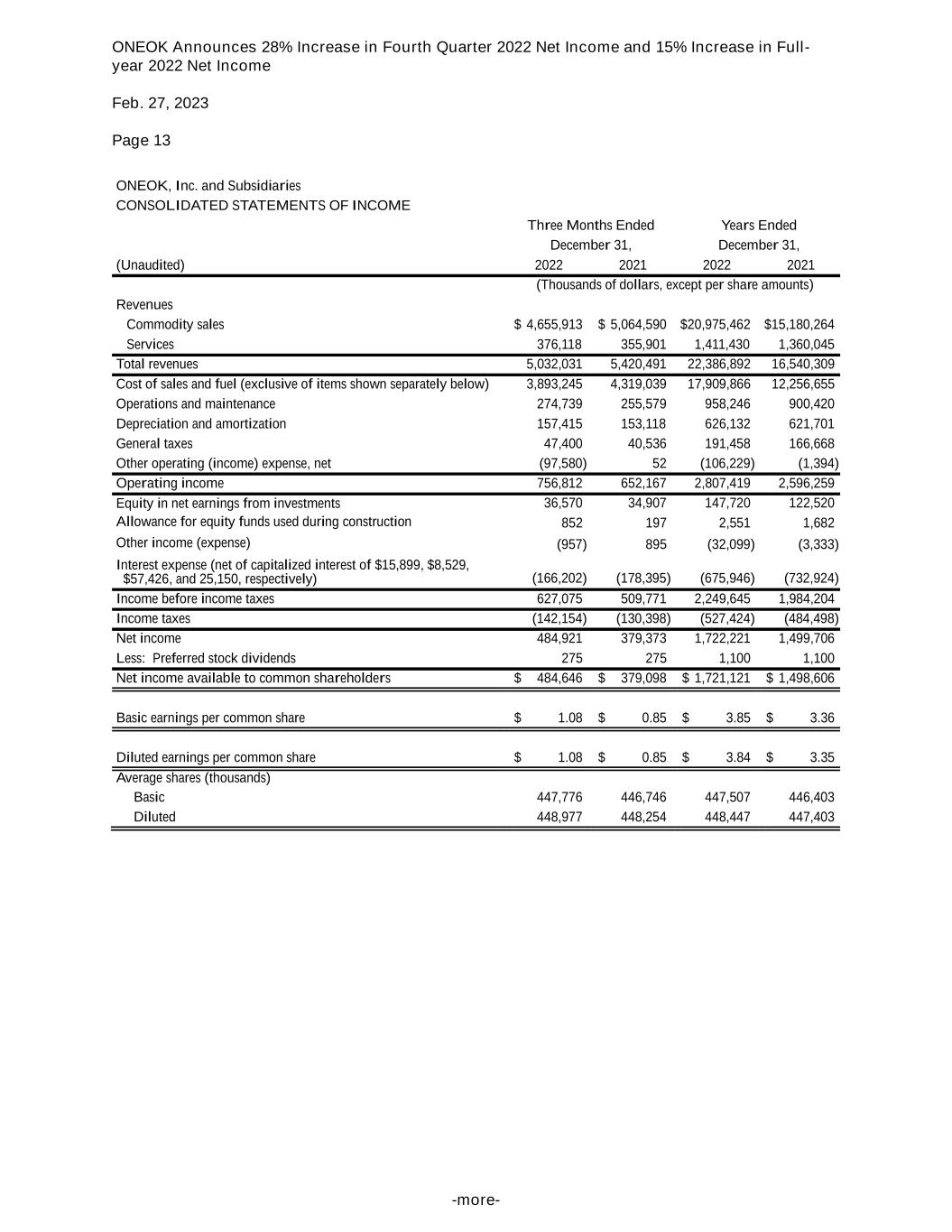 ONEOK Announces 28% Increase in Fourth Quarter 2022 Net Income and 15% Increase in Full- year 2022 Net Income Feb. 27, 2023 Page 13 -more- ONEOK, Inc. and Subsidiaries CONSOLIDATED STATEMENTS OF INCOME Three Months Ended Years Ended December 31, December 31, (Unaudited) 2022 2021 2022 2021 (Thousands of dollars, except per share amounts) Revenues Commodity sales $ 4,655,913 $ 5,064,590 $20,975,462 $15,180,264 Services 376,118 355,901 1,411,430 1,360,045 Total revenues 5,032,031 5,420,491 22,386,892 16,540,309 Cost of sales and fuel (exclusive of items shown separately below) 3,893,245 4,319,039 17,909,866 12,256,655 Operations and maintenance 274,739 255,579 958,246 900,420 Depreciation and amortization 157,415 153,118 626,132 621,701 General taxes 47,400 40,536 191,458 166,668 Other operating (income) expense, net (97,580) 52 (106,229) (1,394) Operating income 756,812 652,167 2,807,419 2,596,259 Equity in net earnings from investments 36,570 34,907 147,720 122,520 Allowance for equity funds used during construction 852 197 2,551 1,682 Other income (expense) (957) 895 (32,099) (3,333) Interest expense (net of capitalized interest of $15,899, $8,529, $57,426, and 25,150, respectively) (166,202) (178,395) (675,946) (732,924) Income before income taxes 627,075 509,771 2,249,645 1,984,204 Income taxes (142,154) (130,398) (527,424) (484,498) Net income 484,921 379,373 1,722,221 1,499,706 Less: Preferred stock dividends 275 275 1,100 1,100 Net income available to common shareholders $ 484,646 $ 379,098 $ 1,721,121 $ 1,498,606 Basic earnings per common share $ 1.08 $ 0.85 $ 3.85 $ 3.36 Diluted earnings per common share $ 1.08 $ 0.85 $ 3.84 $ 3.35 Average shares (thousands) Basic 447,776 446,746 447,507 446,403 Diluted 448,977 448,254 448,447 447,403