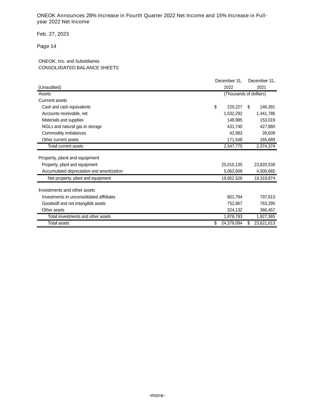 ONEOK Announces 28% Increase in Fourth Quarter 2022 Net Income and 15% Increase in Full- year 2022 Net Income Feb. 27, 2023 Page 14 -more- ONEOK, Inc. and Subsidiaries CONSOLIDATED BALANCE SHEETS December 31, December 31, (Unaudited) 2022 2021 Assets (Thousands of dollars) Current assets Cash and cash equivalents $ 220,227 $ 146,391 Accounts receivable, net 1,532,292 1,441,786 Materials and supplies 148,985 153,019 NGLs and natural gas in storage 431,740 427,880 Commodity imbalances 42,983 39,609 Other current assets 171,548 165,689 Total current assets 2,547,775 2,374,374 Property, plant and equipment Property, plant and equipment 25,015,135 23,820,539 Accumulated depreciation and amortization 5,062,609 4,500,665 Net property, plant and equipment 19,952,526 19,319,874 Investments and other assets Investments in unconsolidated affiliates 801,794 797,613 Goodwill and net intangible assets 752,867 763,295 Other assets 324,132 366,457 Total investments and other assets 1,878,793 1,927,365 Total assets $ 24,379,094 $ 23,621,613
