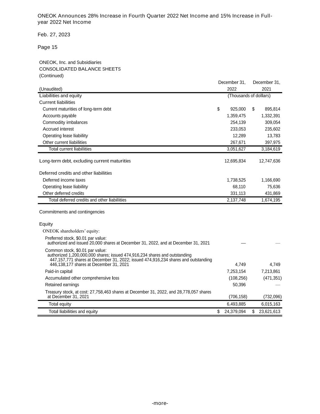 ONEOK Announces 28% Increase in Fourth Quarter 2022 Net Income and 15% Increase in Full- year 2022 Net Income Feb. 27, 2023 Page 15 -more- ONEOK, Inc. and Subsidiaries CONSOLIDATED BALANCE SHEETS (Continued) December 31, December 31, (Unaudited) 2022 2021 Liabilities and equity (Thousands of dollars) Current liabilities Current maturities of long-term debt $ 925,000 $ 895,814 Accounts payable 1,359,475 1,332,391 Commodity imbalances 254,139 309,054 Accrued interest 233,053 235,602 Operating lease liability 12,289 13,783 Other current liabilities 267,671 397,975 Total current liabilities 3,051,627 3,184,619 Long-term debt, excluding current maturities 12,695,834 12,747,636 Deferred credits and other liabilities Deferred income taxes 1,738,525 1,166,690 Operating lease liability 68,110 75,636 Other deferred credits 331,113 431,869 Total deferred credits and other liabilities 2,137,748 1,674,195 Commitments and contingencies Equity ONEOK shareholders’ equity: Preferred stock, $0.01 par value: authorized and issued 20,000 shares at December 31, 2022, and at December 31, 2021 — — Common stock, $0.01 par value: authorized 1,200,000,000 shares; issued 474,916,234 shares and outstanding 447,157,771 shares at December 31, 2022; issued 474,916,234 shares and outstanding 446,138,177 shares at December 31, 2021 4,749 4,749 Paid-in capital 7,253,154 7,213,861 Accumulated other comprehensive loss (108,256) (471,351) Retained earnings 50,396 — Treasury stock, at cost: 27,758,463 shares at December 31, 2022, and 28,778,057 shares at December 31, 2021 (706,158) (732,096) Total equity 6,493,885 6,015,163 Total liabilities and equity $ 24,379,094 $ 23,621,613