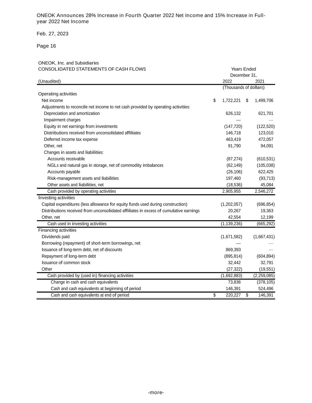 ONEOK Announces 28% Increase in Fourth Quarter 2022 Net Income and 15% Increase in Full- year 2022 Net Income Feb. 27, 2023 Page 16 -more- ONEOK, Inc. and Subsidiaries CONSOLIDATED STATEMENTS OF CASH FLOWS Years Ended December 31, (Unaudited) 2022 2021 (Thousands of dollars) Operating activities Net income $ 1,722,221 $ 1,499,706 Adjustments to reconcile net income to net cash provided by operating activities: Depreciation and amortization 626,132 621,701 Impairment charges — — Equity in net earnings from investments (147,720) (122,520) Distributions received from unconsolidated affiliates 146,718 123,010 Deferred income tax expense 463,419 472,057 Other, net 91,790 94,091 Changes in assets and liabilities: Accounts receivable (87,274) (610,531) NGLs and natural gas in storage, net of commodity imbalances (62,149) (105,038) Accounts payable (26,106) 622,425 Risk-management assets and liabilities 197,460 (93,713) Other assets and liabilities, net (18,536) 45,084 Cash provided by operating activities 2,905,955 2,546,272 Investing activities Capital expenditures (less allowance for equity funds used during construction) (1,202,057) (696,854) Distributions received from unconsolidated affiliates in excess of cumulative earnings 20,267 19,363 Other, net 42,554 12,199 Cash used in investing activities (1,139,236) (665,292) Financing activities Dividends paid (1,671,582) (1,667,431) Borrowing (repayment) of short-term borrowings, net — — Issuance of long-term debt, net of discounts 869,393 — Repayment of long-term debt (895,814) (604,894) Issuance of common stock 32,442 32,791 Other (27,322) (19,551) Cash provided by (used in) financing activities (1,692,883) (2,259,085) Change in cash and cash equivalents 73,836 (378,105) Cash and cash equivalents at beginning of period 146,391 524,496 Cash and cash equivalents at end of period $ 220,227 $ 146,391